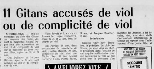 Le 23 octobre 1973, The Sherbrooke Record rapporte que deux membres des Gitans ont traîné une adolescente d’une boîte de nuit avec l’intention de la ramener au camp de St Denis de Brompton pour un viol collectif. La nouvelle a fait la une du Sherbrooke Record mais n’a pas été rapportée dans La Tribune.