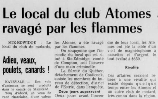 This wasn’t the first incident known to police, but it was the first time the public learned of the rivalry – not from La Tribune, but in Sherbrooke’s other, English newspaper, The Record. According to police sources the violence had begun two years earlier when Gitans ripped the colors or patches off of Atomes members, an act seen as unpardonable. Skirmishes ensued outside nightclubs and parking lots. In late September, the Atomes camp in Edwidge – a village 15 kilometers southeast of Compton – was burned to the ground by Gitans. According to police, the conflicts boiled down to territory, “The Gitans do not believe there is enough room in Sherbrooke for two gangs.”
