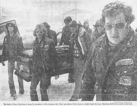 Bikers’ WarThe violence began at the brasserie La Boustifaille on King Street east Friday, March 15, 1974. Three members of the Gitans were sitting around a table having a beer when six members of the Atoms arrived and immediately started to challenge the Gitans. The parties moved to the parking lot of La Boustifaille where about twenty members of the Atomes and Gitans fought with guns, chains, and baseball bats. Robert Provencher from Coaticook, a member of the Atomes, was shot in the back, and Jacques Filteau from Sherbrooke, a member of the Gitans, was knifed in the stomach. You will guess correctly that Filteau recovered from his wounds, as he would later be cited in the CECO report on Quebec organized crime.