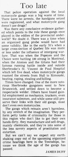 In a May 4, 1979 editorial for The Sherbrooke Record, then editor, James Duff heralded the end of the biker gang era. Duff was always a good report of questionable judgement and insight (recall it was Duff chiefly who defended a serial predator while attacking the victim in The Tale of Mr. Morton ). Duff argued that times had changed, and by 1979 most of the notorious Sherbrooke bikers from the Gitans – Atomes era had gone legit; becoming welders, mechanics, truckers, “even insurance salesmen”… “most don’t even own motorcycles” he told readers, without citing any evidence, of course: