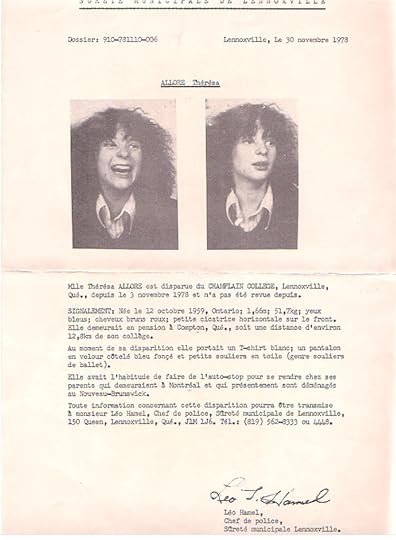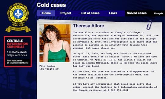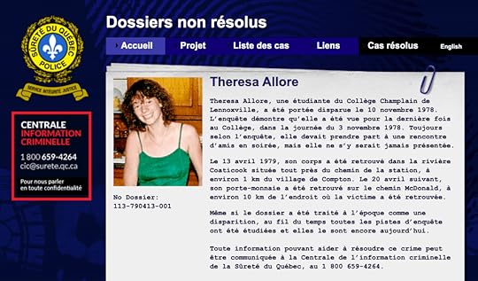 For those who have followed this website or read Wish You Were Here you know that Camirand was the beginning of a series of similar unsolved murders that ended in 1979 with the discovery of my sister’s body in Compton Quebec – from Camirand to the ‘unidentified’ Longueuil victim (today positively identified as Evelyne Levasseur-Pulice) to Jocelyne Houle, then the summer murders of Johanne Dorion and Chantal Tremblay, the fall 1977 series of Katherine Hawkes, Denise Basinet and Helene Monast, Lison Blais in 1978, then finally Manon Dubé and Theresa Allore. By the end of 1977, Louise Camirand had become a statistic: one of 197 murders committed in the province of Quebec that year. In Statistics Canada’s 2005 report on homicide, Quebec had the highest number of homicides in 1977 of any province. Over the course of the seventies, Quebec had the worst clearance rate for homicide cases in the country.
