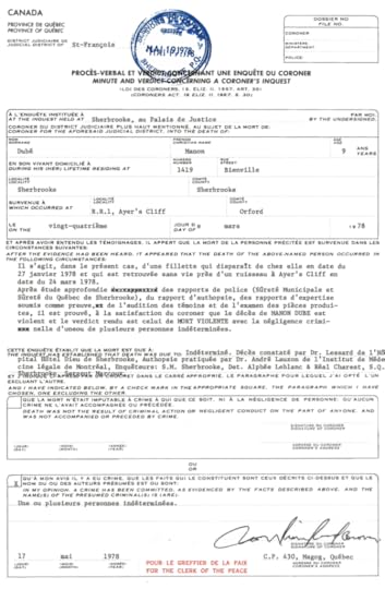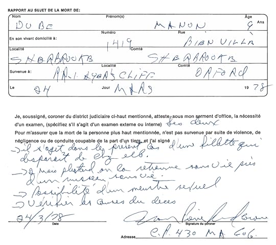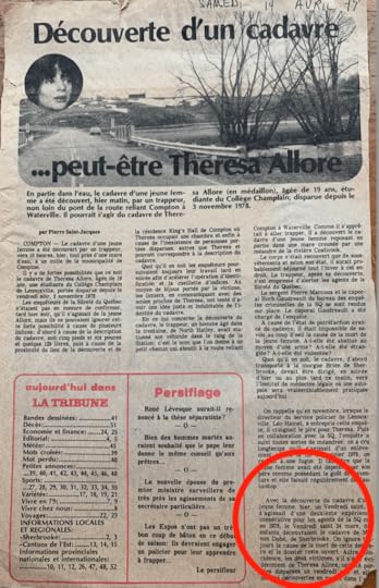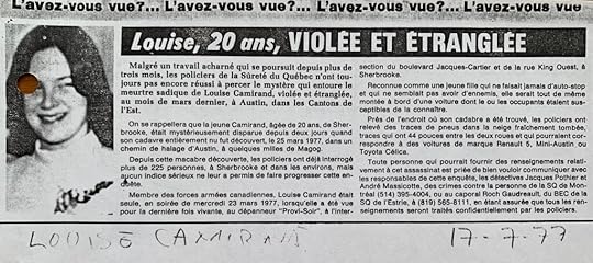CorporealI’ll tell you what many of you have already guessed, and some are just realizing – awaking to a grim reality. It’s not the lone assassin that links these Townships’ deaths, it’s the questionable and possibly dark intentions of the ones who investigated the crimes. In every case there is the jolt of the murder, then a swift and mediocre response, and general sense to get back to business as usual. Maintain the order. Keep the peace. This was the response to Theresa Allore and Manon Dube. It was the reaction to Carole Fecteau’s murder (though we have yet to arrive at that destination). It was overwhelmingly the response in the Rock Forest affair in 1983, which we covered last year. The City of Sherbrooke was desperate to assure the public there was no there there: trust the police, hold no one accountable, get on with life. And it was the case with Louise Camirand.