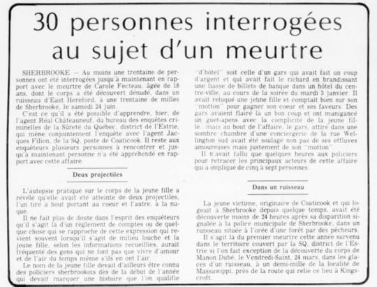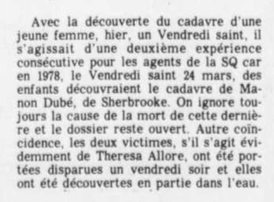 CorporealJe vais vous dire ce que beaucoup d’entre vous ont déjà deviné, et certains commencent à peine à s’éveiller à une sombre réalité. Ce n’est pas le seul assassin qui relie les décès de ces cantons, ce sont les intentions douteuses et peut-être sombres de ceux qui ont enquêté sur les crimes. Dans tous les cas, il y a le sursaut du meurtre, puis une réaction rapide et médiocre, et le bon sens de reprendre le cours normal des choses. Maintenir l’ordre. Gardez la paix. C’était la réponse à Theresa Allore et Manon Dubé. C’était la réaction au meurtre de Carole Fecteau (bien que nous n’ayons pas encore atteint cette destination). C’était en grande partie la réponse dans l’affaire Rock Forest en 1983, dont nous avons parlé l’année dernière. La ville de Sherbrooke voulait désespérément assurer au public qu’il n’y avait rien là-bas: faites confiance à la police, ne tenez personne pour responsable, continuez à vivre. Et ce fut le cas de Louise Camirand.