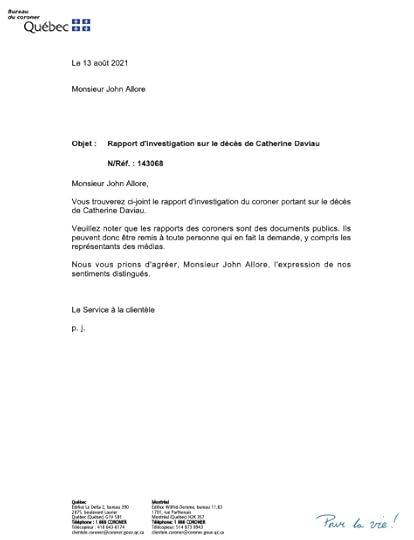 Tullaugak’s coroner’s report was filed over 14 months later, even though both victims died within 24 hours of each other. In May 2019 coroner Karine Spenard wrote, “Siasi Ikidluak Tullaugak died of suffocation by hanging”, then concluded “This is a violent death.” The report goes on to say that it is not the role of the coroner to pronounce the civil or criminal person responsible in such matters, and, as this is “still an open file at the SPVM”, the analysis of the event remains open.