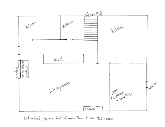 To detail the house I know it is in a small community, maybe right on the outside of one. There is a field that basically starts at the end of the back yard. It is large, like acres and acres of field. The front of the house has lots of trees but I don’t know what is past them. Directly right (when looking out the front door) is a neighbors house, it looks like it needs a paint job. I think it was like a pale blue green color. Nothing I can see to the left, not sure of the closest house or structure. I feel like it is a 1 1/2 story house but I can’t be certain of that. Inside there is a main level and upper level. I have attached a hand drawn floor plan of what I saw.