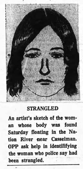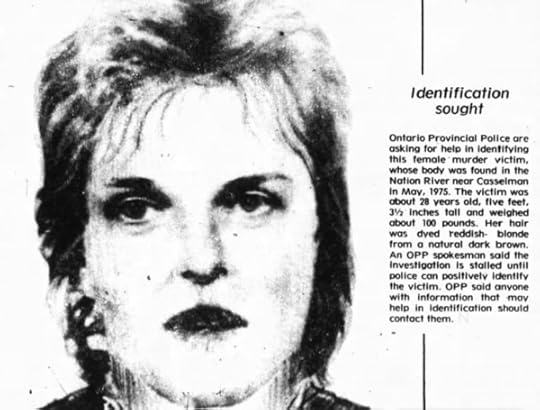 Have you heard of the Casselman / Nation River Lady case? Around 10 a.m. on Saturday, May 3, 1975, farmer Claude Legault was repairing a fence when he came upon the body of a woman floating face down beneath the 417 highway overpass crossing the Nation River near Casselman, Ontario, about 30 kilometres southeast of Ottawa, and 80 kilometres west of Saint Polycarpe. Officers from the Long Sault Ontario Provincial Police force (OPP) determined the victim had been strangled, with her hands and feet bound by neckties before she was dumped in the river approximately two weeks to a month before being found. The victim was naked, except for a blue blouse which was fully buttoned up the front. She was believed to be between 20 and 30 years of age, five feet and three inches tall, with long bleached blonde hair, and weighed approximately 115 pounds. The autopsy would reveal that she had not been sexually assaulted, and had been strangled with an antenna wire.