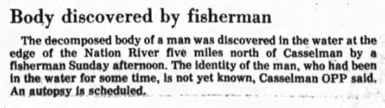 In 1979, the body of a man is discovered in the Nation River about 5 miles north of Casselman. Like the Nation River Lady, the OPP say the body has been in the water for quite some time. Police later identify the man as 74-year-old George Chitouas, a resident of the Casselman Nursing Home, who regularly went for walks near the river: