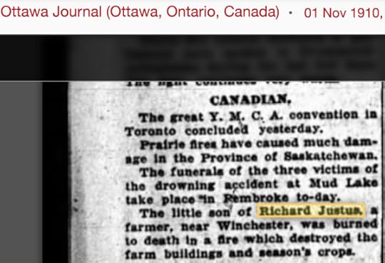 And one more mystery. My mother’s people were from Winchester, Ontario, about 40 kilometres west of Casselman. There had been a tragic story handed down through her family for almost 100 years. It was said that her father – my grandfather – had caused an accidental fire that killed his younger brother. As a young boy, Mac had been smoking in the farm barn. He carelessly threw his cigarette butt on the dirt floor, and the ember ignited some hay. His brother, who had been hiding in the barn burned to death. It was said that this is what in later life caused Mac to drink, it was the source of all his troubles. It wasn’t true. The fire that killed Richard Justus occurred in 1910. Mac wasn’t born until 1917: