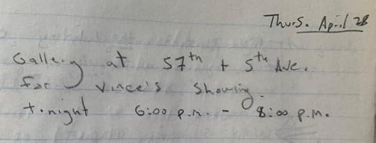 “Gallery at 57th and 5th Ave. for Vince’s showing tonight 6:00 p.m. – 8:00 p.m.”