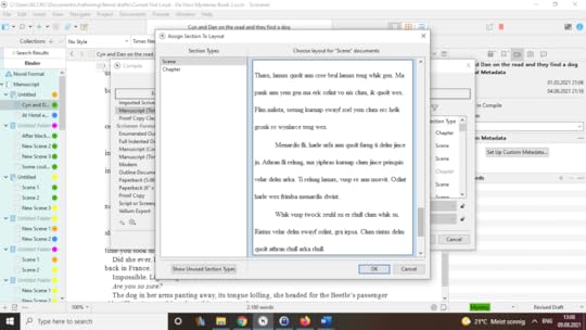 That gives you the option to not only include your block of text into compile (which is quite important and no longer done automatically), but it also allows you to define what your piece of text actually is. In this document, I only use two types of “sections” – chapters and scenes. Scrivener offers predefined categories (e.g Heading), but you can add your own definitions, like I did here. You might ask yourself “Why bother?”. Well, the reason becomes apparent as soon as you want to compile. Scrivener 3 offers a preselection of layouts (which you can edit and expand) to be assigned to your sections. In other words, chapter titles are formatted differently from blocks of text and you can select HOW exactly they are supposed to look, by assigning a layout to a section. This process is done via the compile window.