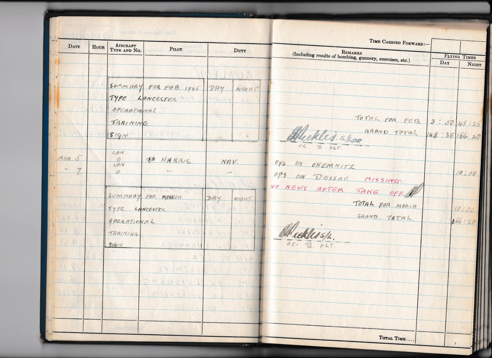 It is unclear why in Hicks' flight logs (courtesy the Hicks family) a page of March 1945 operations appears on the page prior to February, and stranger still that they are crossed out. There is no record of Hicks having ever flown with Nielson’s crew.