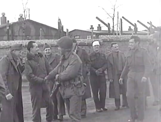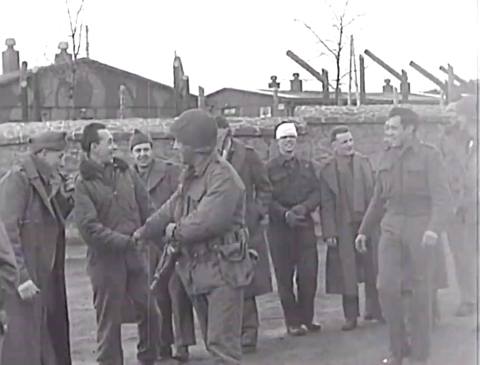 In this video still, rear air gunner Douglas Hicks (with bandaged forehead) celebrates the liberation of Dulag Luft with his fellow POWs, including long-time prisoner Sergeant Edward Hill at bottom left. The video clip, obtained from CriticalPast.com (labelled Wetzlar, Germany, March 29, 1945 LIB 4857) is one of several discovered by Rolf G. Wilmink, a 75th U.S. Infantry Division history investigator. Three American war correspondents were brought into the camp that day, including noted journalist Jack Belden, though it is unclear who took the original footage. Unfortunately Nicol did not appear in any of the video of the liberation of Dulag Luft.