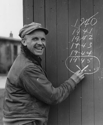 Sergeant Edward Hill (Squadron unknown) celebrates the end of five years as a POW when Dulag Luft was liberated . Hill was working at Dulag Luft as an Allied administrator at the camp which explains why he looks so friendly with what was left of the German officers.