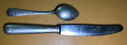 Knife and spoon, imprinted with the Luftwaffe insignia, taken by air bomber Gordon Nicol from Dulag Luft as a memento. The other side of the cutlery is imprinted with FLUV which stands for Flieger unterkunft verwaltung, meaning ‘supplies for Flyer’s quarters.’