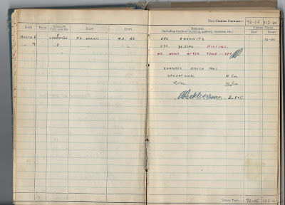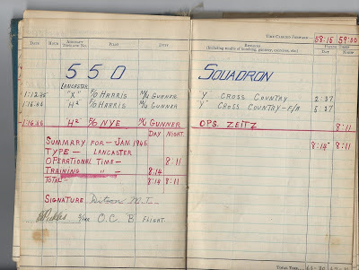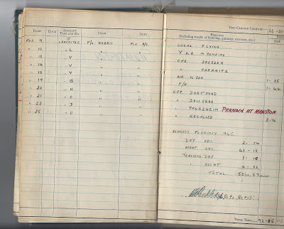 Tom Ditson's flight logs (courtesy of the Ditson family) from 550 Squadron are a bit of a mystery in that several of operations listed, Ditson did not participate in. It is possible the logs were completed by someone else at North Killingholme, who may not have been aware Ditson missed three of the Harris Crew's operations due to illness and two more after being injured during the Pforzheim raid.