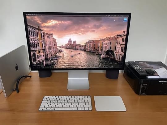 I got a 15″ M2 MacBook Air a bit over a year ago, and it is terrific — perfect in its intended role as a stay-at-home but move-from-room-to-room, laptop/table-top. The additional screen real-estate over the 13″ is very definitely worth having e.g. for LaTeX. In fact, I’ve found myself using my iMac less and less. And then, when I have used the iMac for multi-window work — e.g. most recently, when indexing Introducing Category Theory — I’ve found the iMac a bit frustrating, wishing the screen were that bit bigger again. So, I promised myself a somewhat indulgent treat if I got through the operation ok, namely to trade in the iMac for an Apple Studio Display. Which has arrived. And as you can see, looks just fantastic. I played a bit this afternoon with e.g. LaTeX windows open and a PDF of another book on screen, and it works brilliantly.