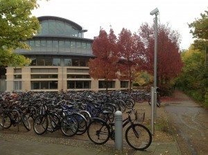 (The snap was taken yesterday, just a few yards from the Newton Institute building, looking across the bikes parked outside the Centre for Mathematical Sciences towards the Moore Library there.)