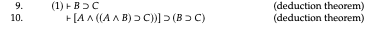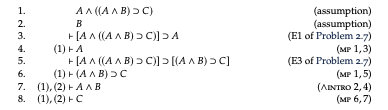 This is followed by the comment “Note that lines 1 and 2 do not have a ⊢ in front of them. They are assumptions, not theorems. We indicate on the left of the turnstile which assumptions a line makes use of. For instance, line 4 is proved from lines 1 and 3, but line 3 is a theorem — it does not use any assumptions.” But first, with this sort of Lemmon-esque layout, shouldn’t the initial lines have turnstiles after all? Shouldn’t the first line commence, after the line number, with “(1) ⊢” — since the assumption that the line makes use of is itself? And more seriously, in so far we can talk of line (9) as being derived from what’s gone before, it is the whole line read in effect as a sequent which is derived from line (8) read as a sequent — it’s not an individual formula derived from earlier ones by a rule of inference. So in fact this just isn’t a derivation any more in the original sense given in IPT in characterizing axiomatic derivations.
