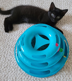 So, sadly, Heidi just wasn't fitting in well here. After we cracked through her shy persona, she became a little too aggressive with her biting and scratching to the point that I was scared to have one-year-old Ruby go near her for fear of what Heidi might do. Heidi also liked to run away when I went to pick her up, so she wasn't exactly the cuddle bug I'd envisioned. Plus, she and Juniper didn't get along together at all, which was a real bummer. Through the experience, my parents and I learned that there is a very valuable question to ask when adopting a pet from a rescue center: "How long was he/she out in the wild?" In Heidi's case, she'd been out in the wild for eight weeks . . . which explained her sometimes-shy, sometimes-belligerent personality. We had to take her back. 😢 Thankfully, we were allowed to swap her for another kitten: this one an eight-week-old with an absolutely endearing personality who'd been rescued by the center at ten days of age. She has a gorgeous brown/black coat and soft green-blue eyes. I named her Ethel Mae, after the character from the I Love Lucy television series. 😊