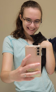 Besides adopting a new kitten, my days have been filled with college classes (I'm LOVING the English, but the math . . . not so much 😂). Also, my hair was getting really long and straggly. I finally learned how to messy bun it using two rubber bands (bobby pins are too much work 🤣) but the length of my hair when it was loose could still get frustrating. So, my mom gave me another one of her famous home hair cuts (evidenced through the pictures in this post), and I love how light and fresh it feels!!