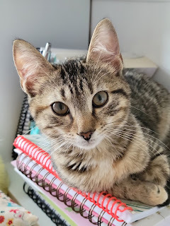 Then my sweet, dear Ethel Mae turned into a biting, scratching kitten who didn't like to be held and could be violent at night (she liked to pounce on my face) and when she played. So, we unfortunately had to take her back to the rescue center also. 😢 They let us swap cats again, and we came home with a 12-week-old tabby I named Shalom, which is the Hebrew word for "peace." As of right now, she seems to be very promising: gentle, sweet, playful, and she loves loves LOVES to cuddle. Third time is a charm, right?
