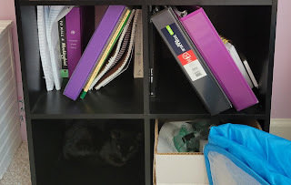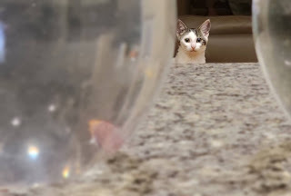 We're currently teaching Juniper she has to stay off the counters (where we have our fish, Garrett). The spunky kitten likes to jump on our kitchen stools to reach this high, forbidden area. She also likes to climb into the pantry and curl up in the "snack drawer," away from little hands.