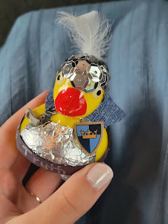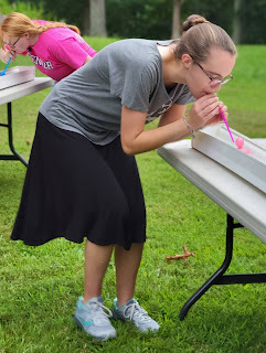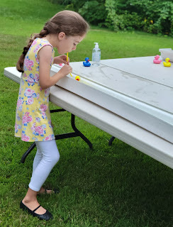 Over the weekend our church had a "duck race," in which members of the congregation both decorated ducks for a contest AND raced plain plastic ducks in gutters with straws. Afterward, everyone cooled off with a bowl of ice cream and talked. That was lots of fun, even if a storm came upon us suddenly (meaning we had to rush home through rain, wind, and lightning) and my legs got eaten up by bugs.
