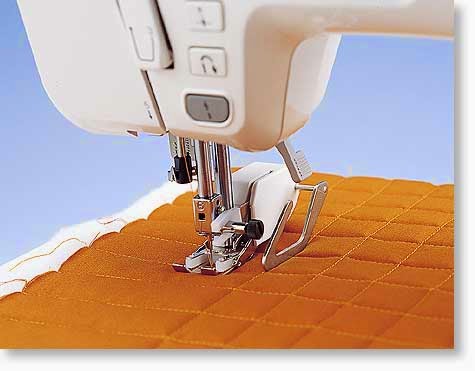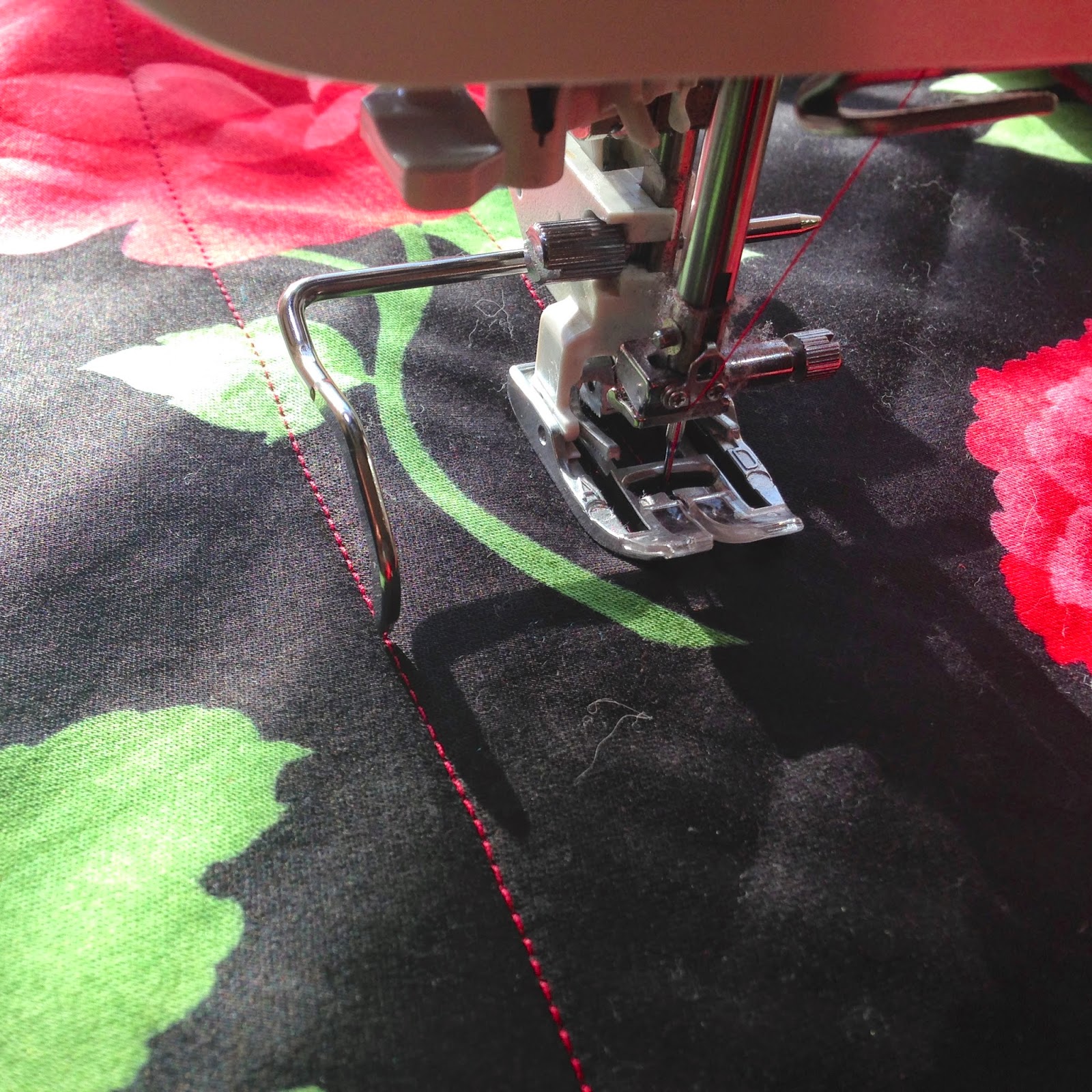 Once you're happy with everything, start stitching along the tape. Remove the tape and stitch parallel lines, using either the guide on your walking foot or more rows of tape. Hey, the quilting guide even works well when you put the bar in upside down! (Whoops.)