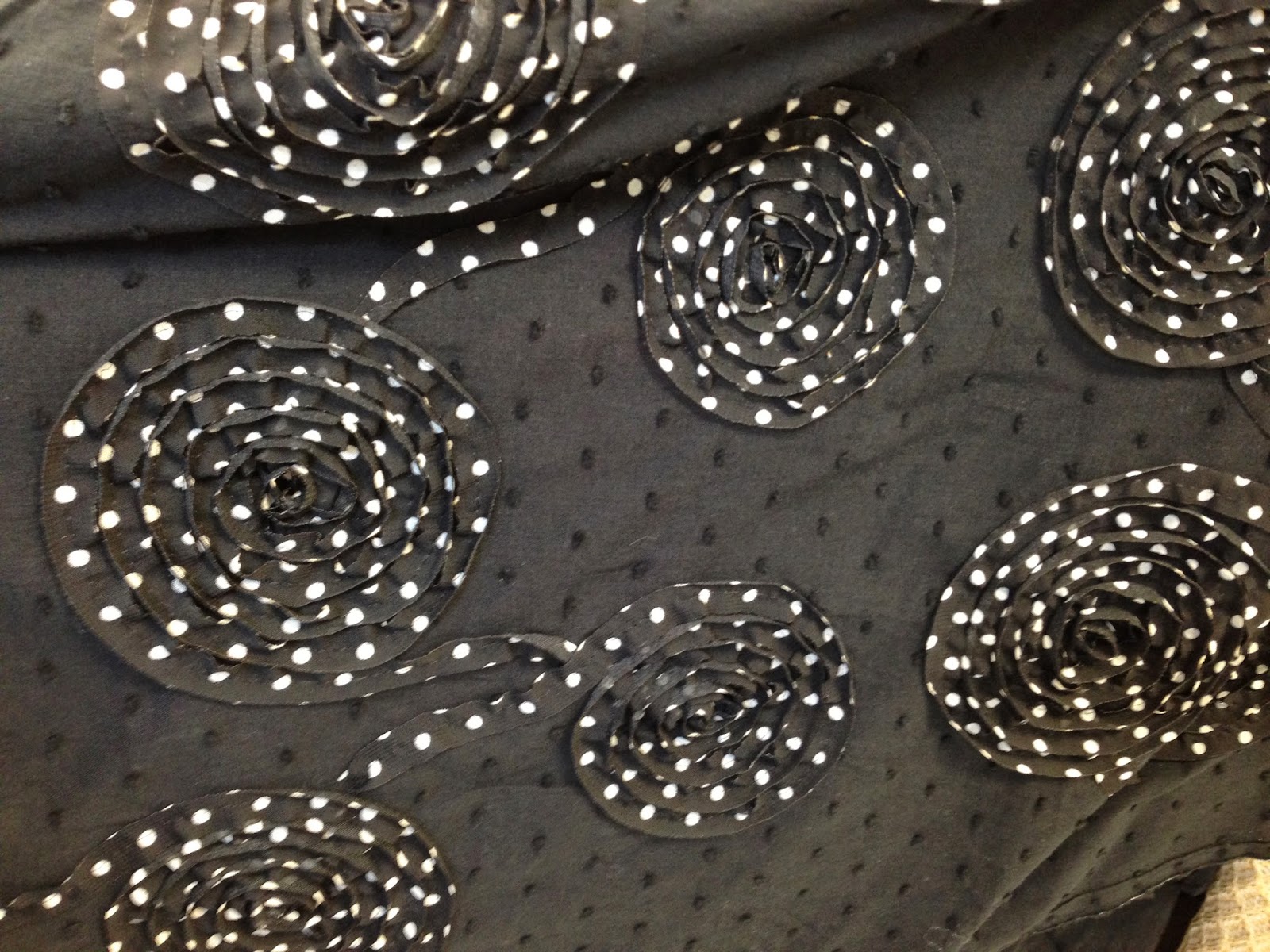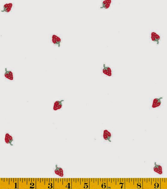 Embroidered Strawberry CottonAnd finally (whew!): a really cool novelty weave fabric. It's a swiss dot cotton with polka dot chiffon "pinwheels" appliqued on top. This is super special and would make a beautiful full circle skirt.