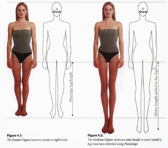 Have you ever bought one of those fashion sketchpads filled with croquis (body figure templates) all excited to hash out your ideas? And then once you realize the figures are a little bizarre-looking, your excitement fades a bit? (By "bizarre," I mean that the figures are strangely elongated and spindly, and twisted into strange poses like the "broken doll" or the "sad alien.") That's because fashion people work with a concept called "nine heads," where the figure is nine head-lengths tall. To put this in perspective, actual people are only seven to eight heads tall. Here's an interesting image that breaks it down: