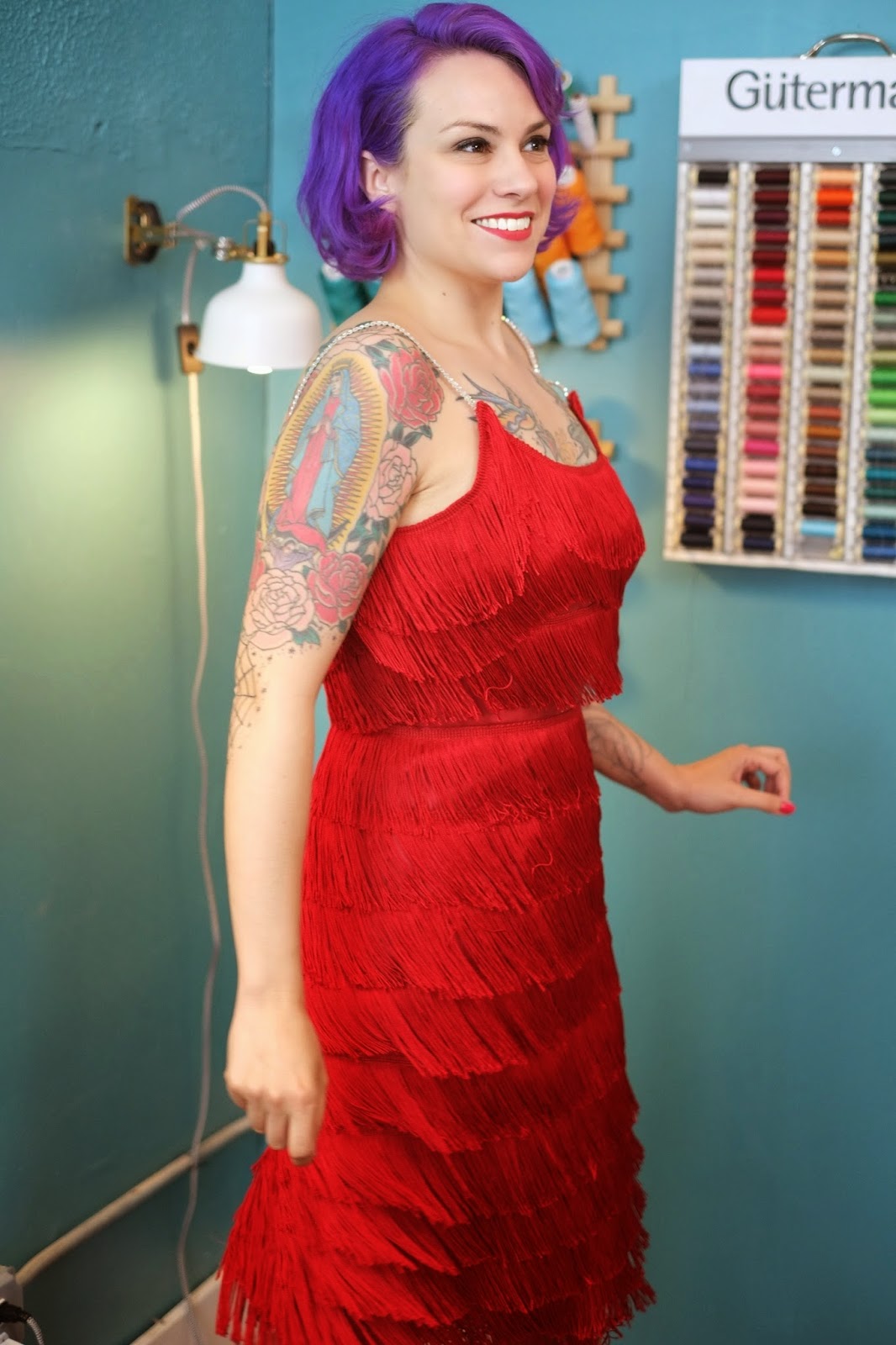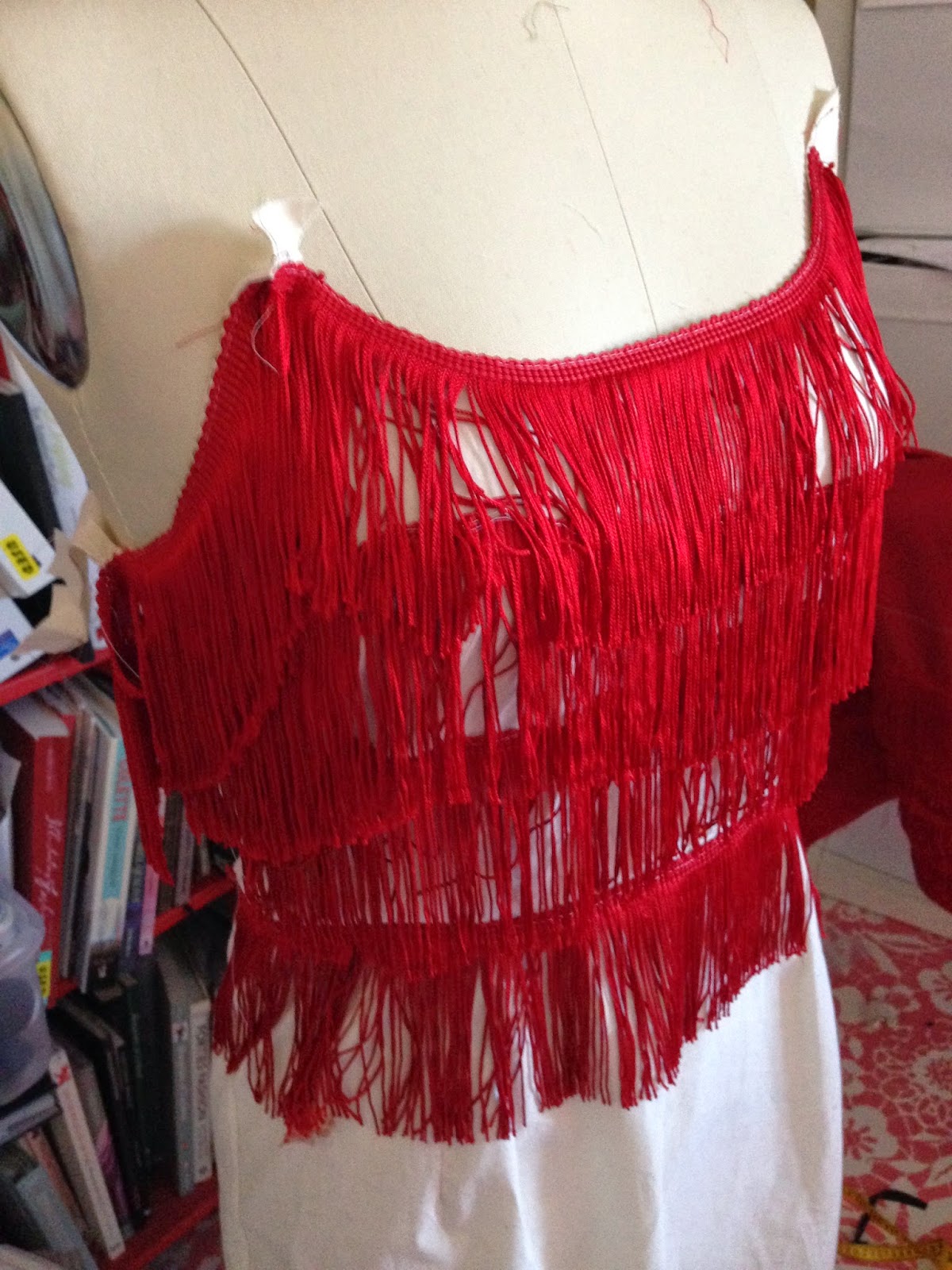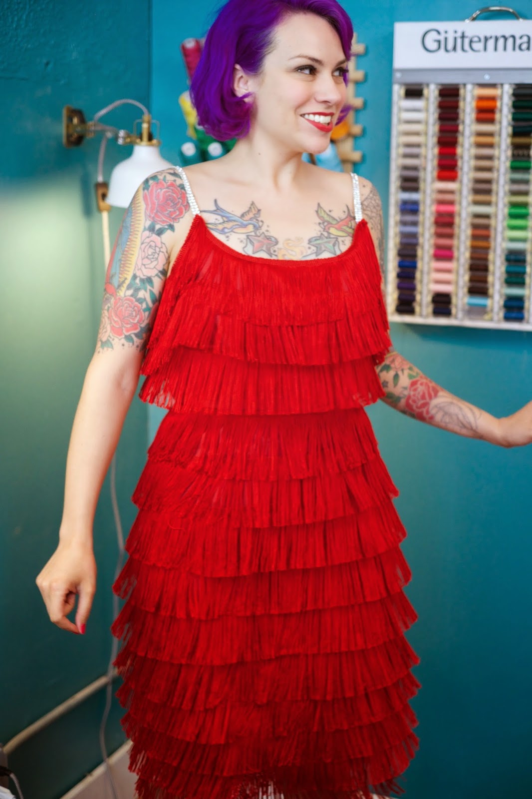 I managed to get 40 yards (!) of red chainette fringe at Daytona Trimming in NYC--if you buy the bolt, you get 50% off. How could I resist? I had enough fringe to make a test version, the dress itself, and trim some really cool shirts for my band mate fellas.