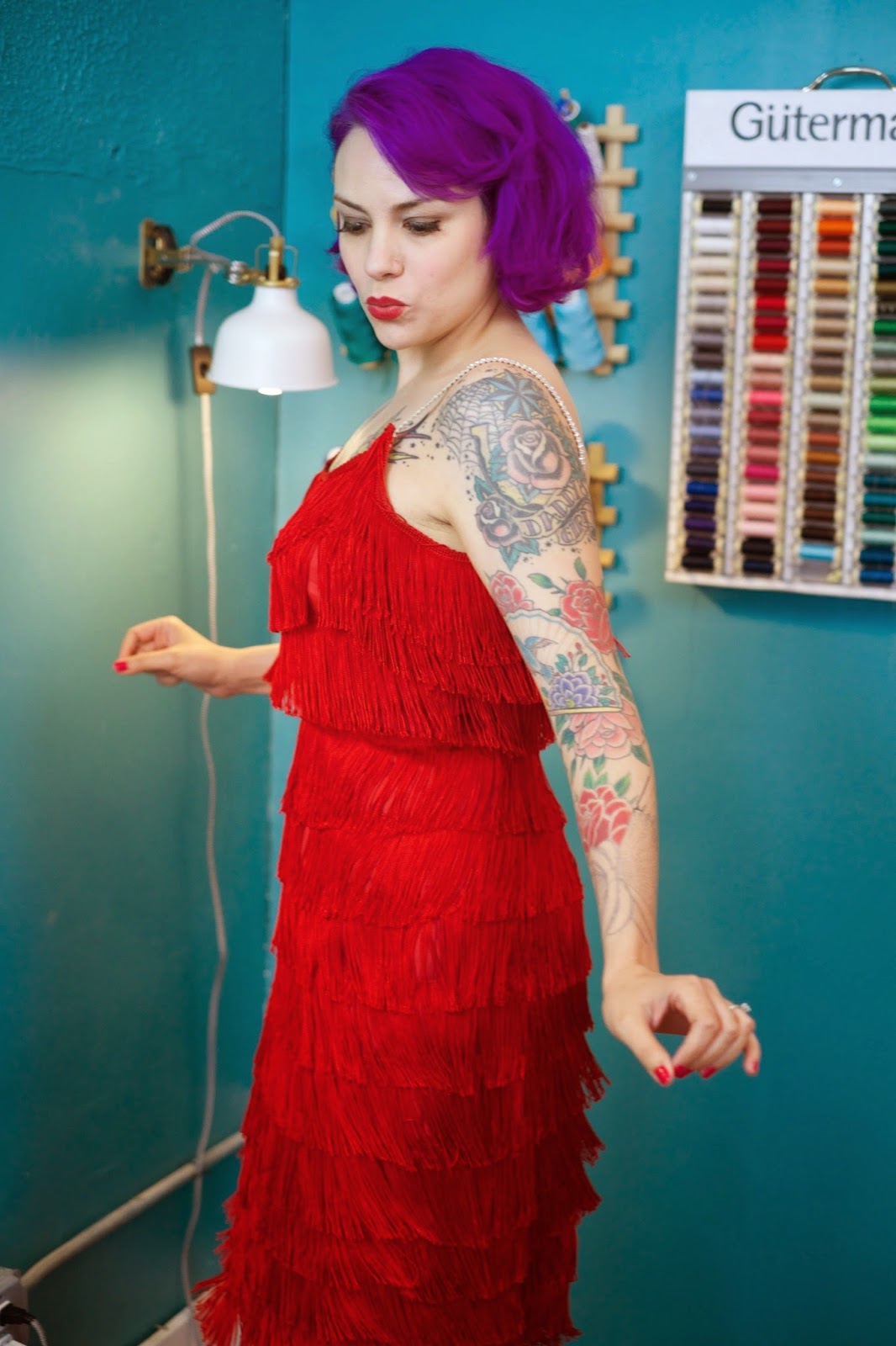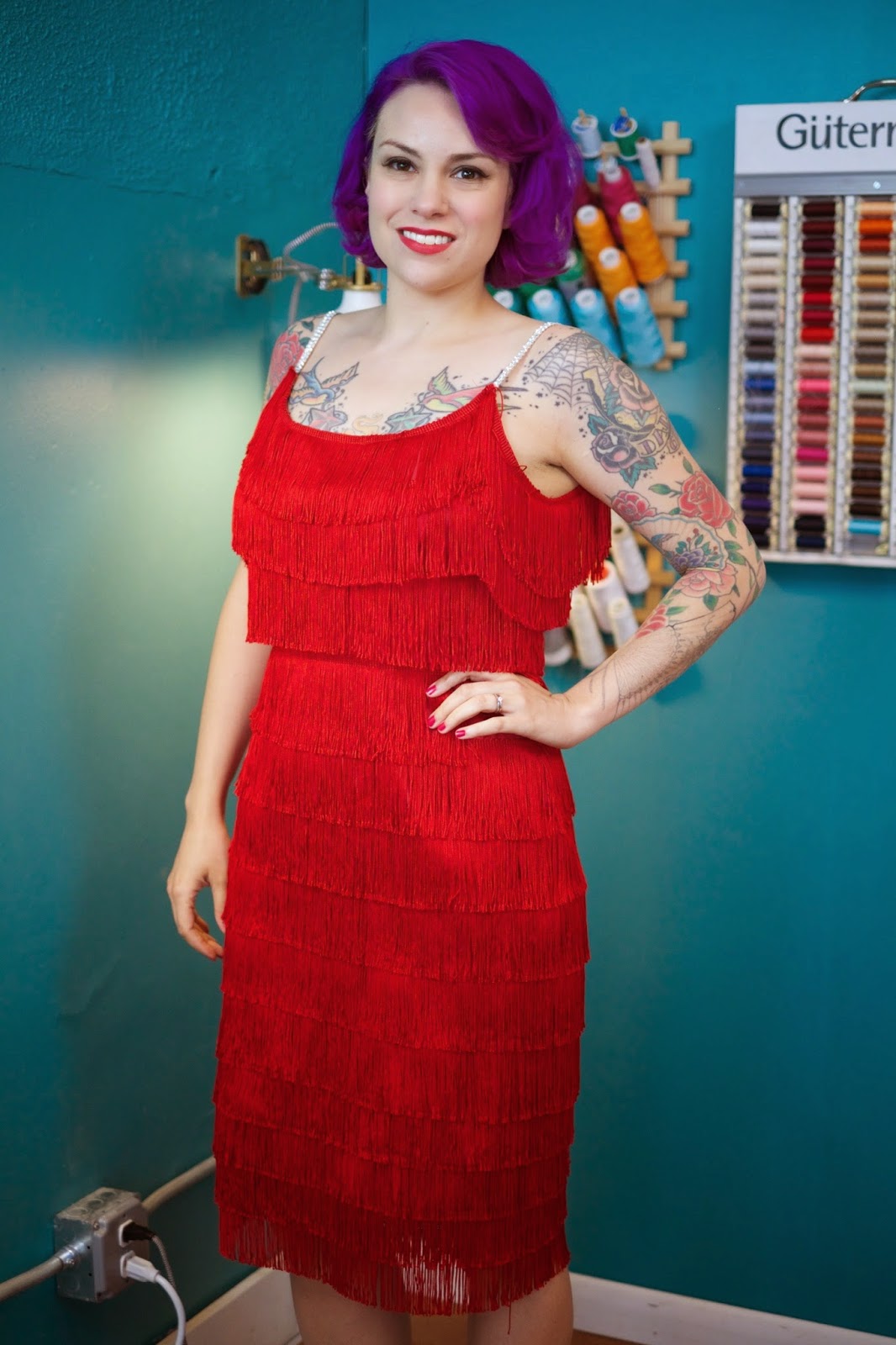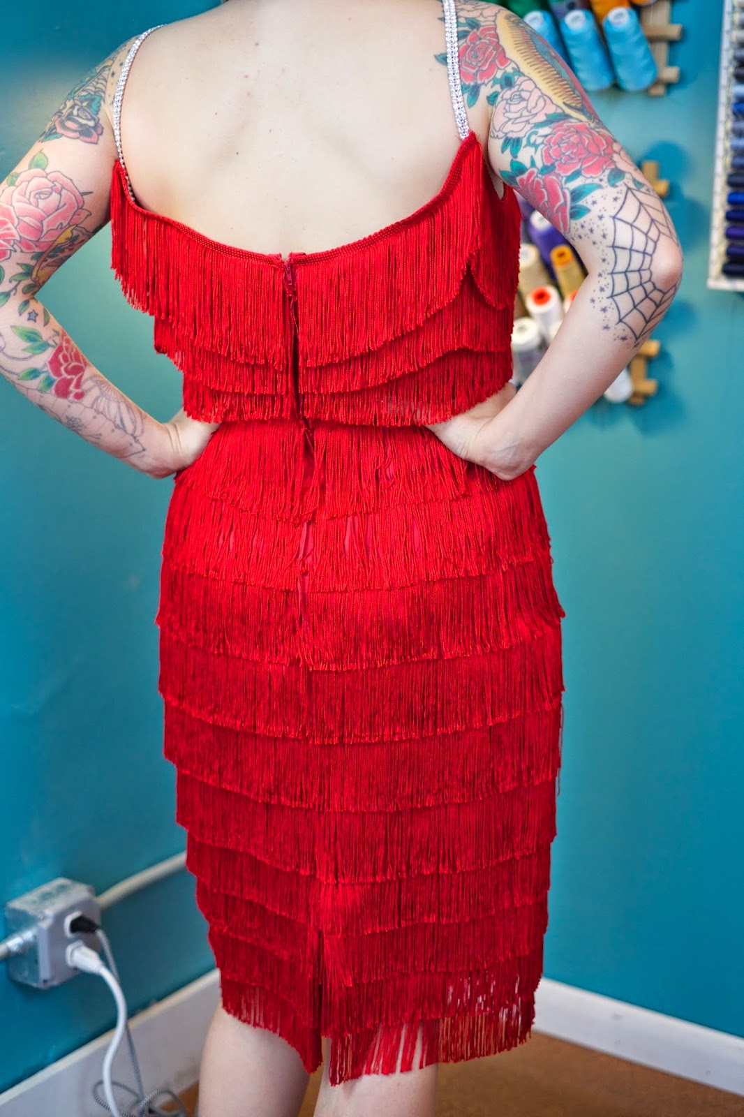 I managed to get 40 yards (!) of red chainette fringe at Daytona Trimming in NYC--if you buy the bolt, you get 50% off. How could I resist? I had enough fringe to make a test version, the dress itself, and trim some really cool shirts for my band mate fellas.