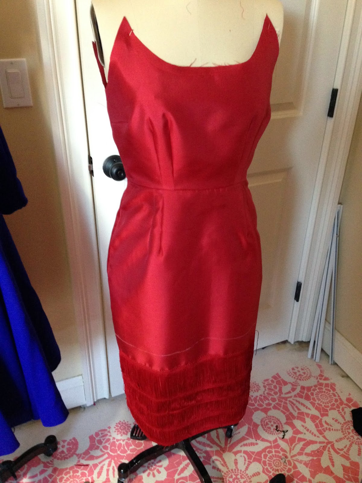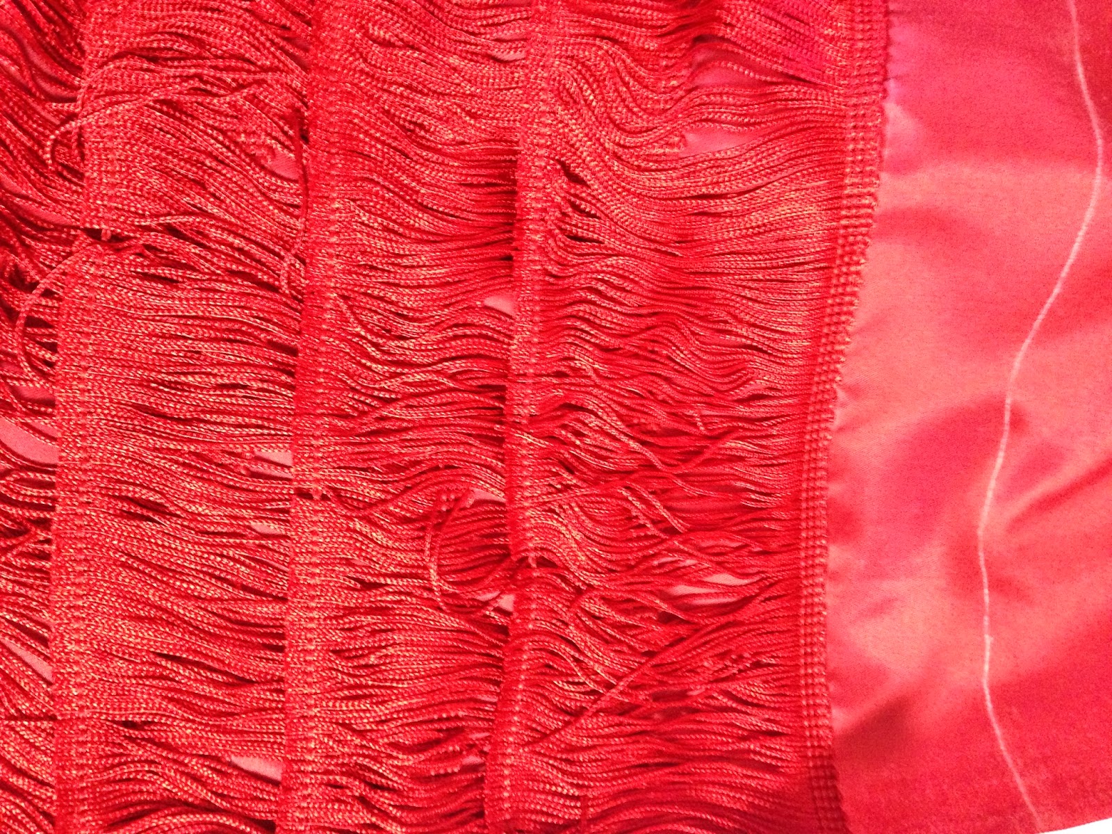 The dress itself is made out of silk zibeline, which I'd never sewn with before. I originally wanted faille, but they were sold out in red. I knew I needed something strong enough to support several pounds of fringe, and the zibeline was perfect. It has a lot of body, so it was the perfect base. Here it is, mid-fringeing. It was almost a shame to cover it up.