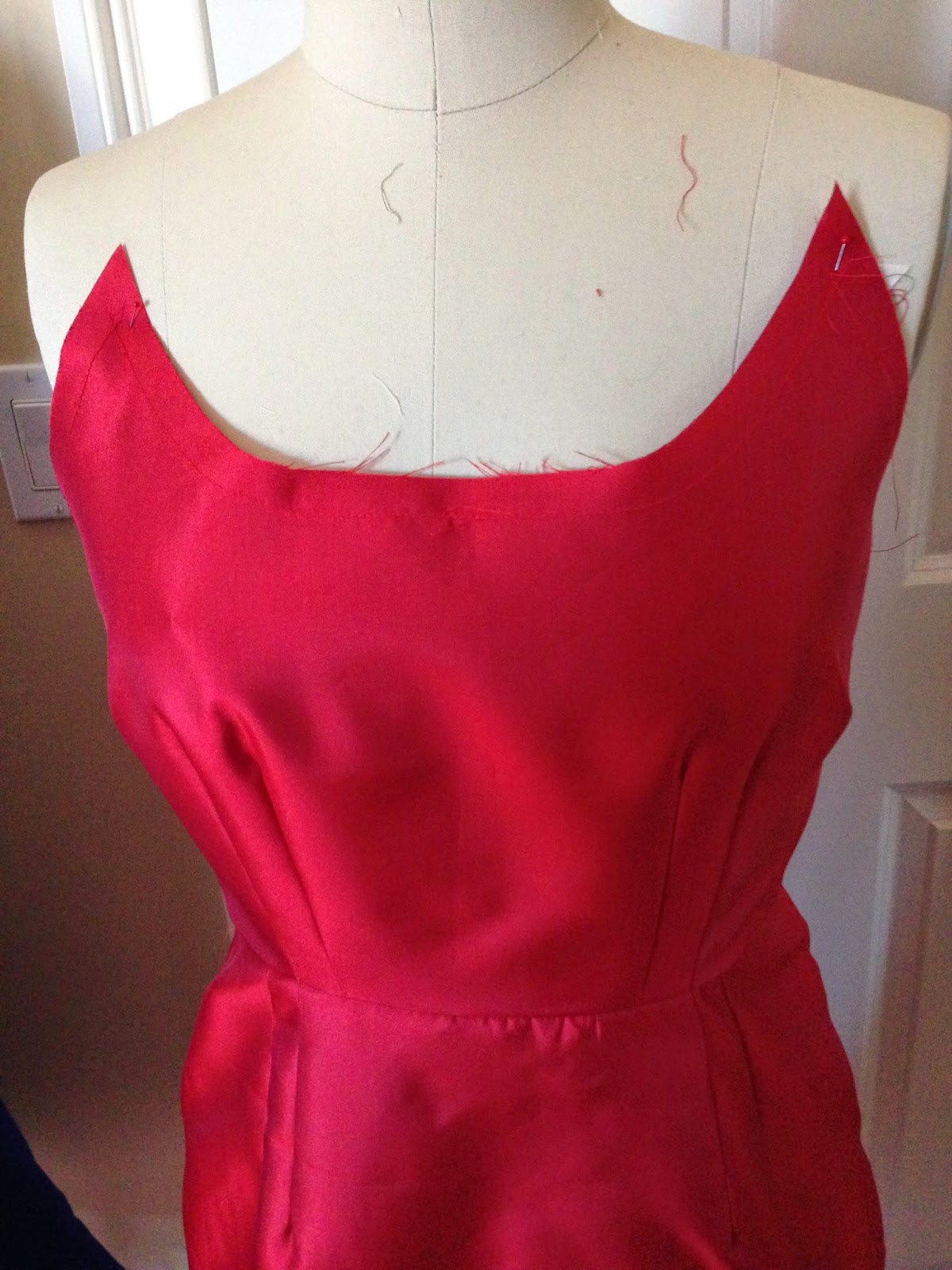 Then, I just turned in the neckline seam allowances at hand stitched them in place. The silk crepe de chine lining is hand stitched on top of that seam allowance. (Or it would be, if I'd gotten around to sewing the lining in before the performance. Whoops . . . It's on my ironing board, still waiting to be sewn in.)
