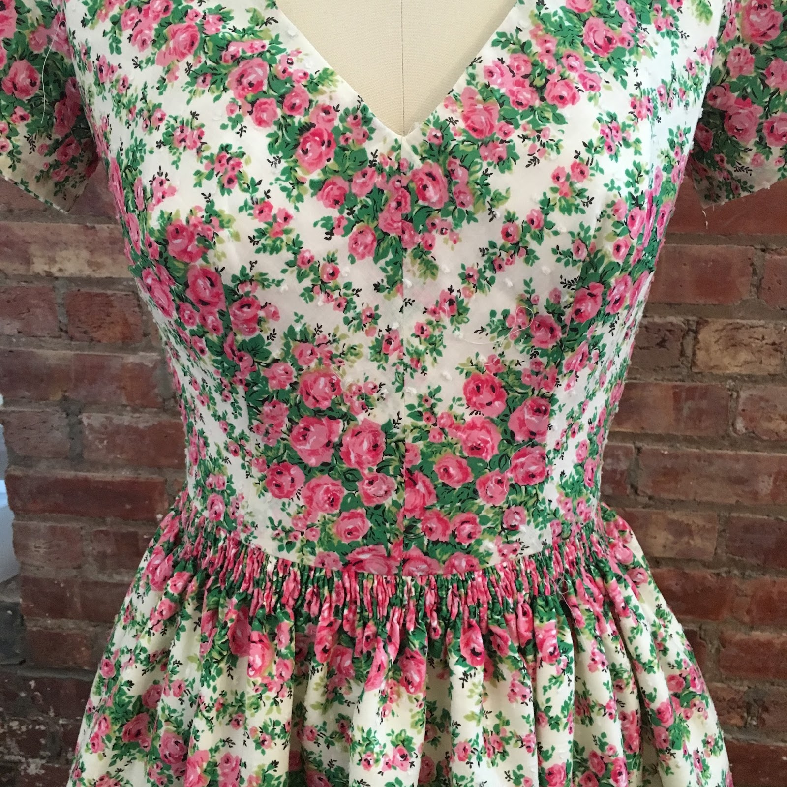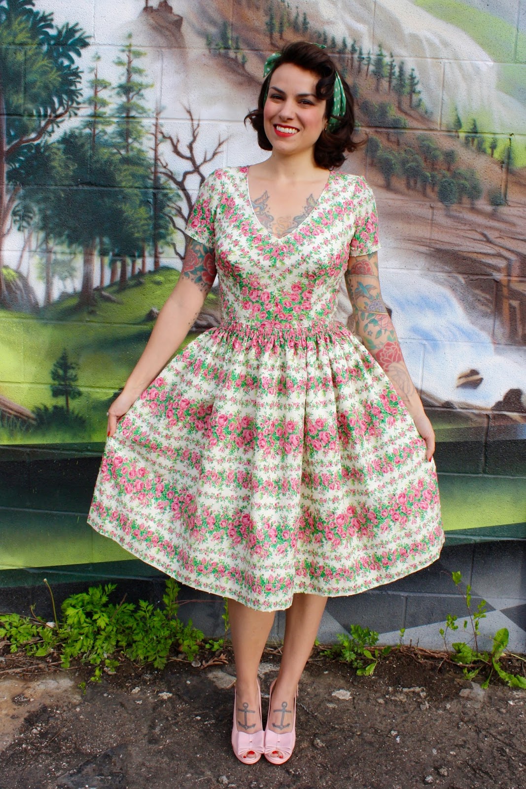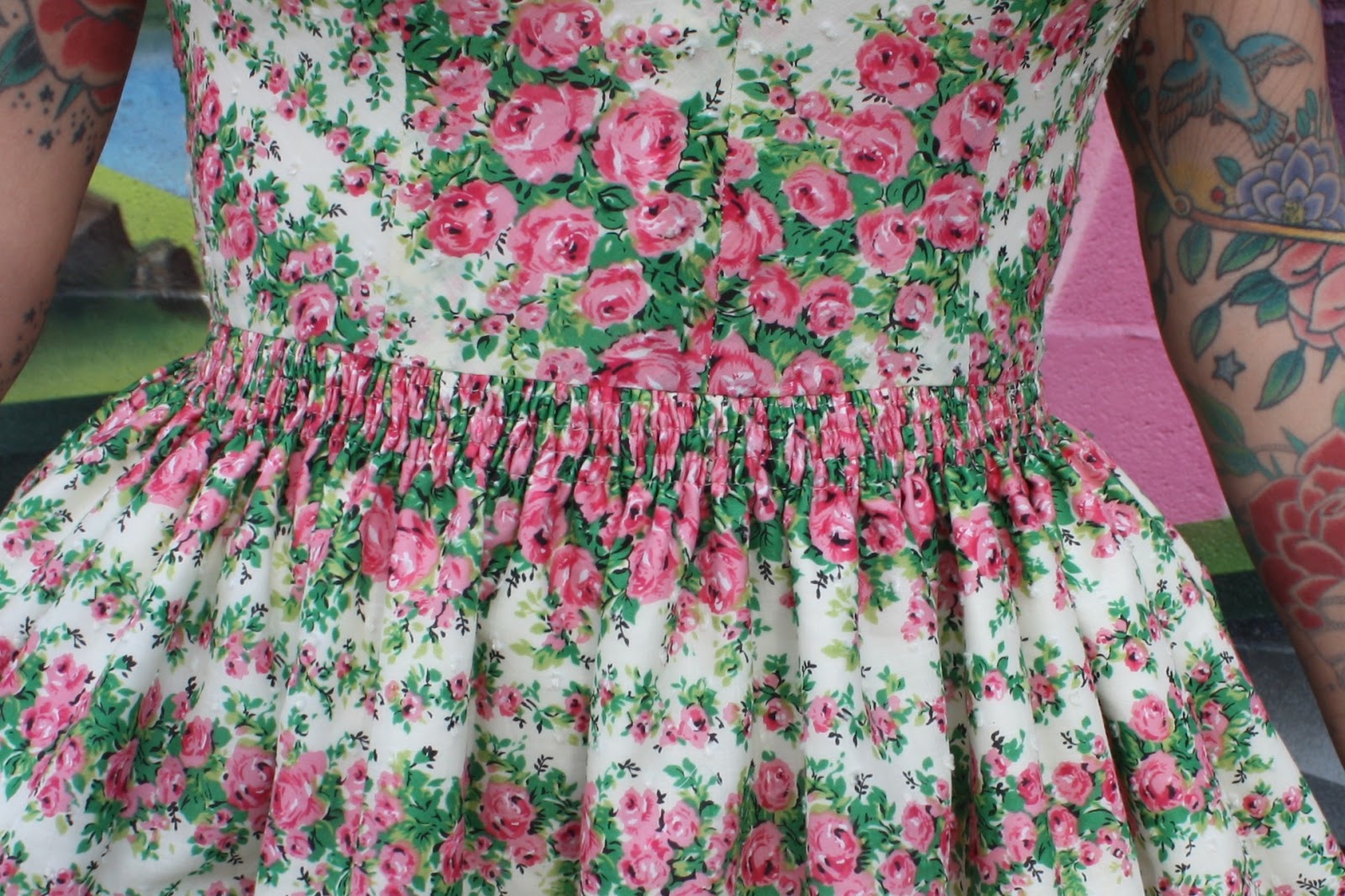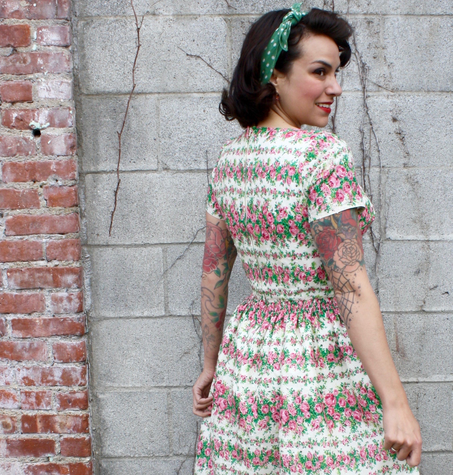 This fabric was directly inspired by vintage Horrockses dresses. Horrockses was a British brand that made the most lovely day dresses of the '40s and '50s. They were especially known for their house-designed prints and one of their trademarks was the floral stripe.