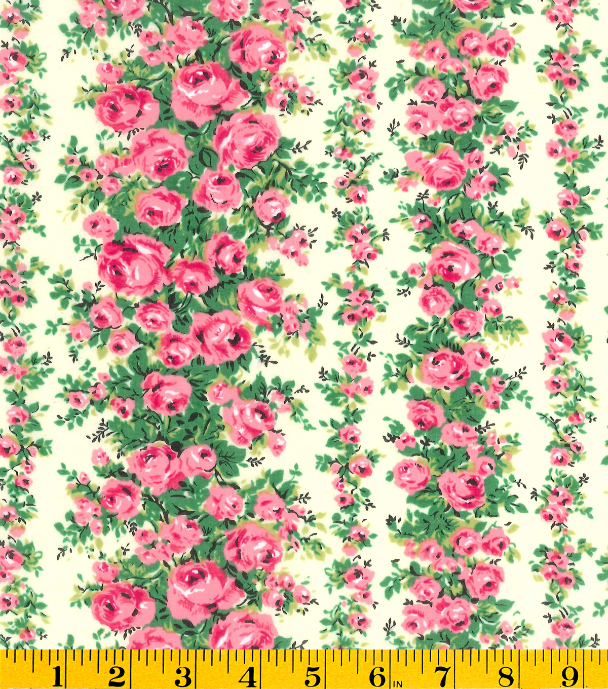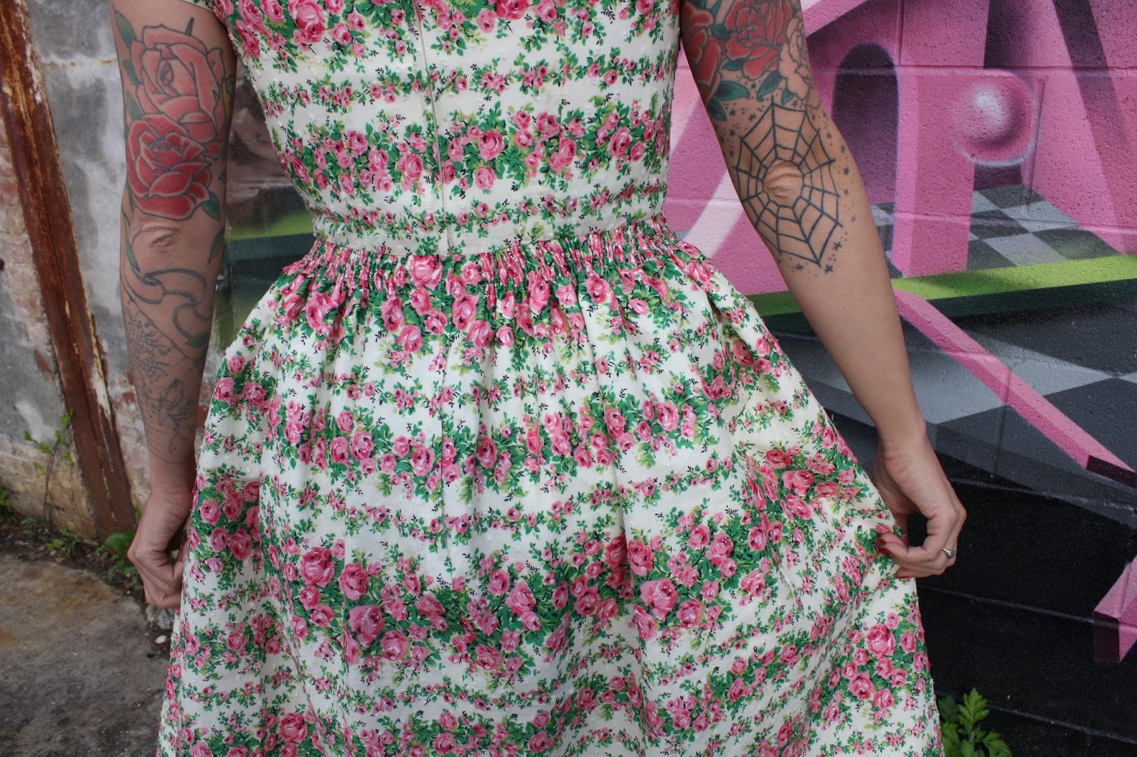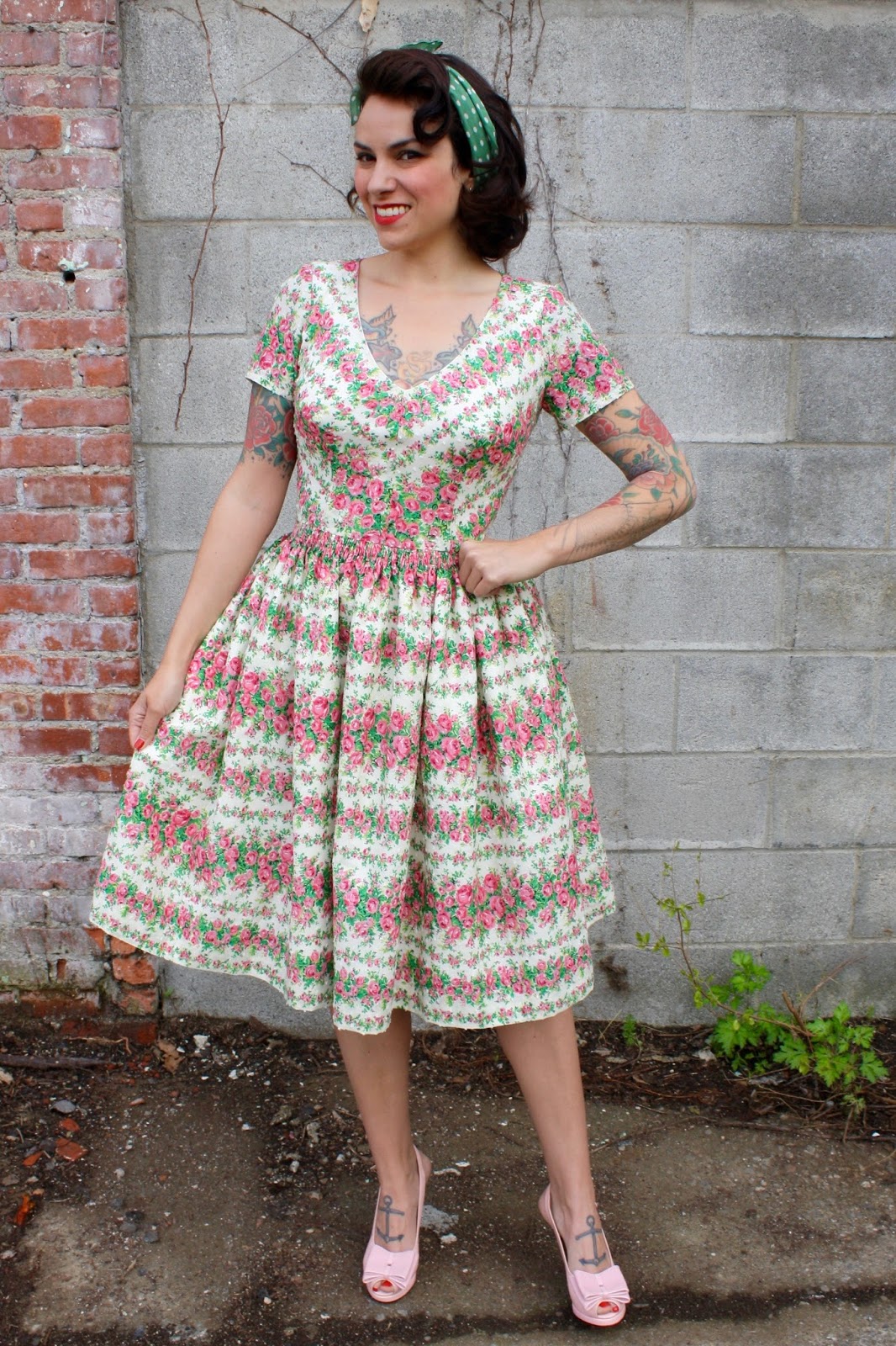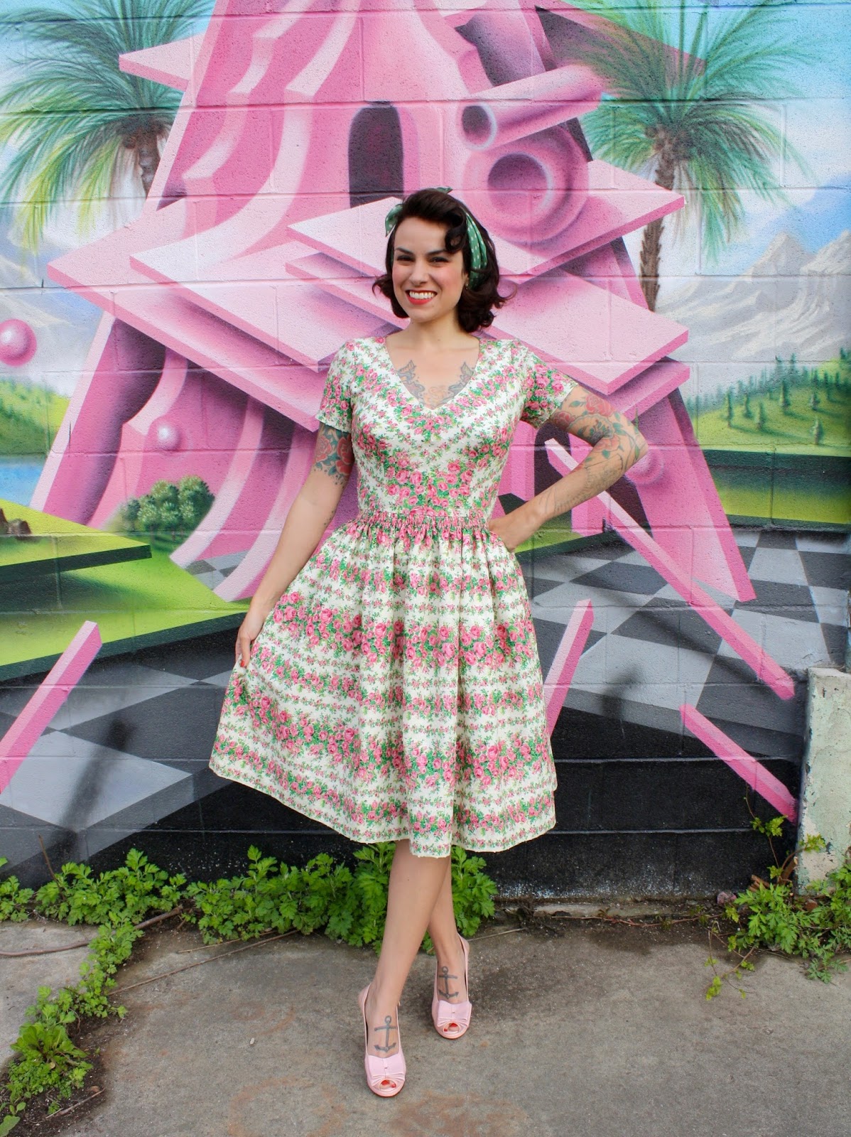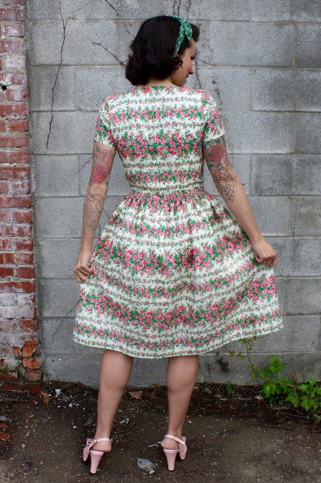 This fabric was directly inspired by vintage Horrockses dresses. Horrockses was a British brand that made the most lovely day dresses of the '40s and '50s. They were especially known for their house-designed prints and one of their trademarks was the floral stripe.