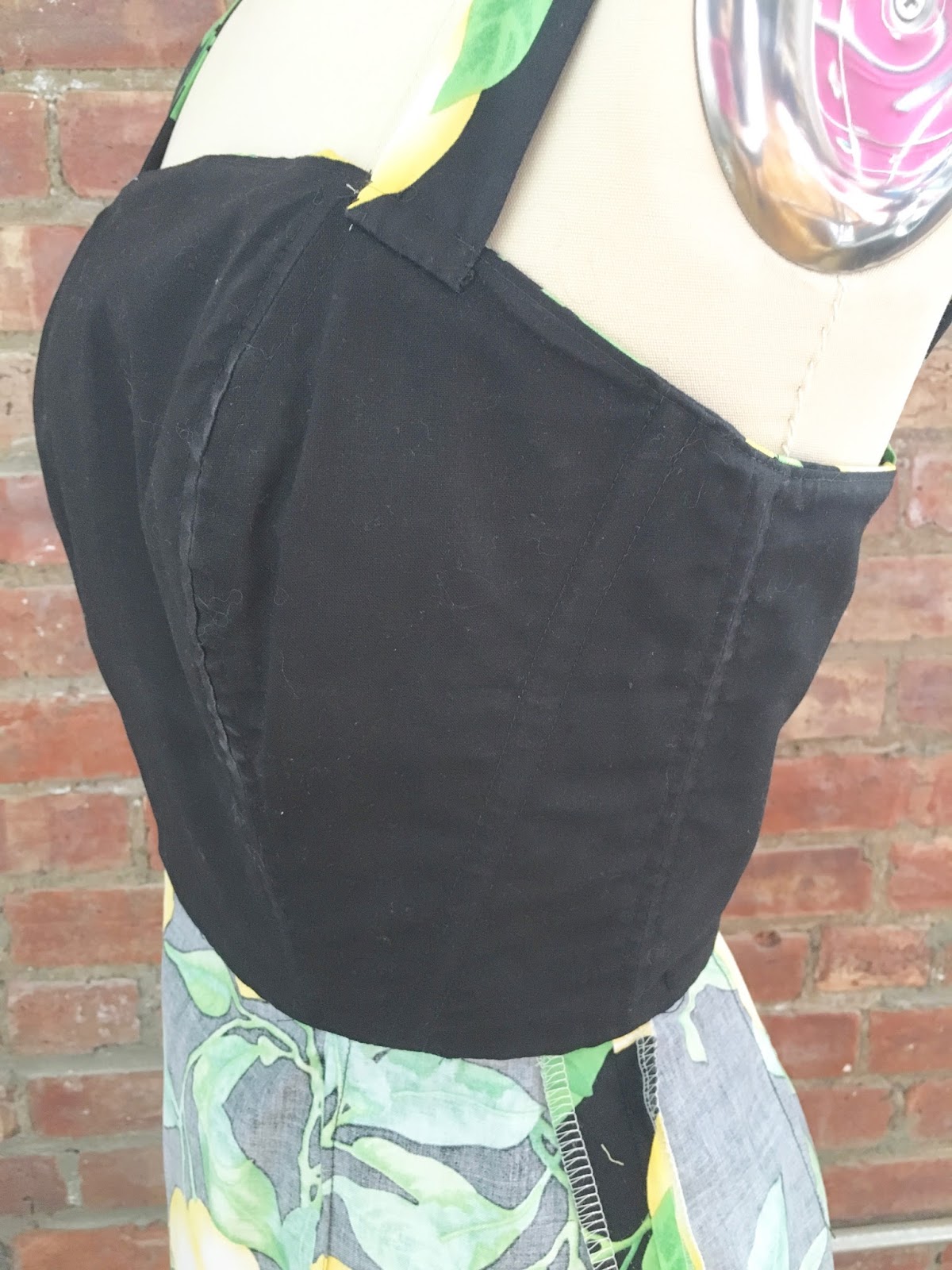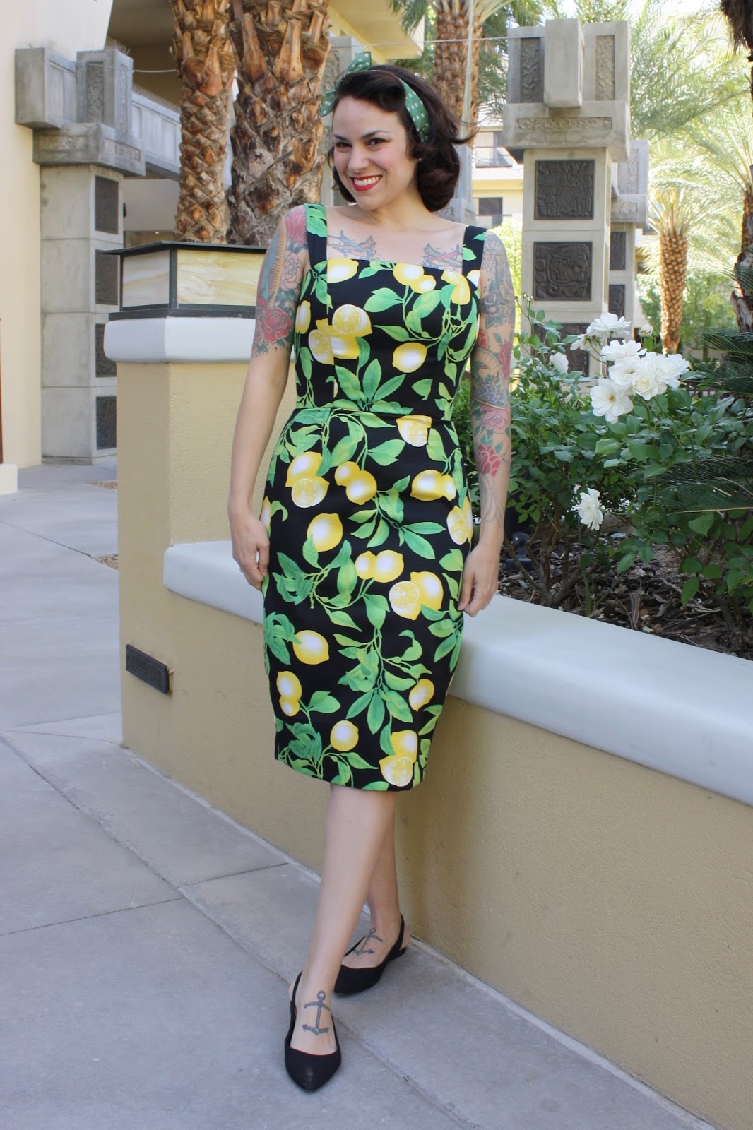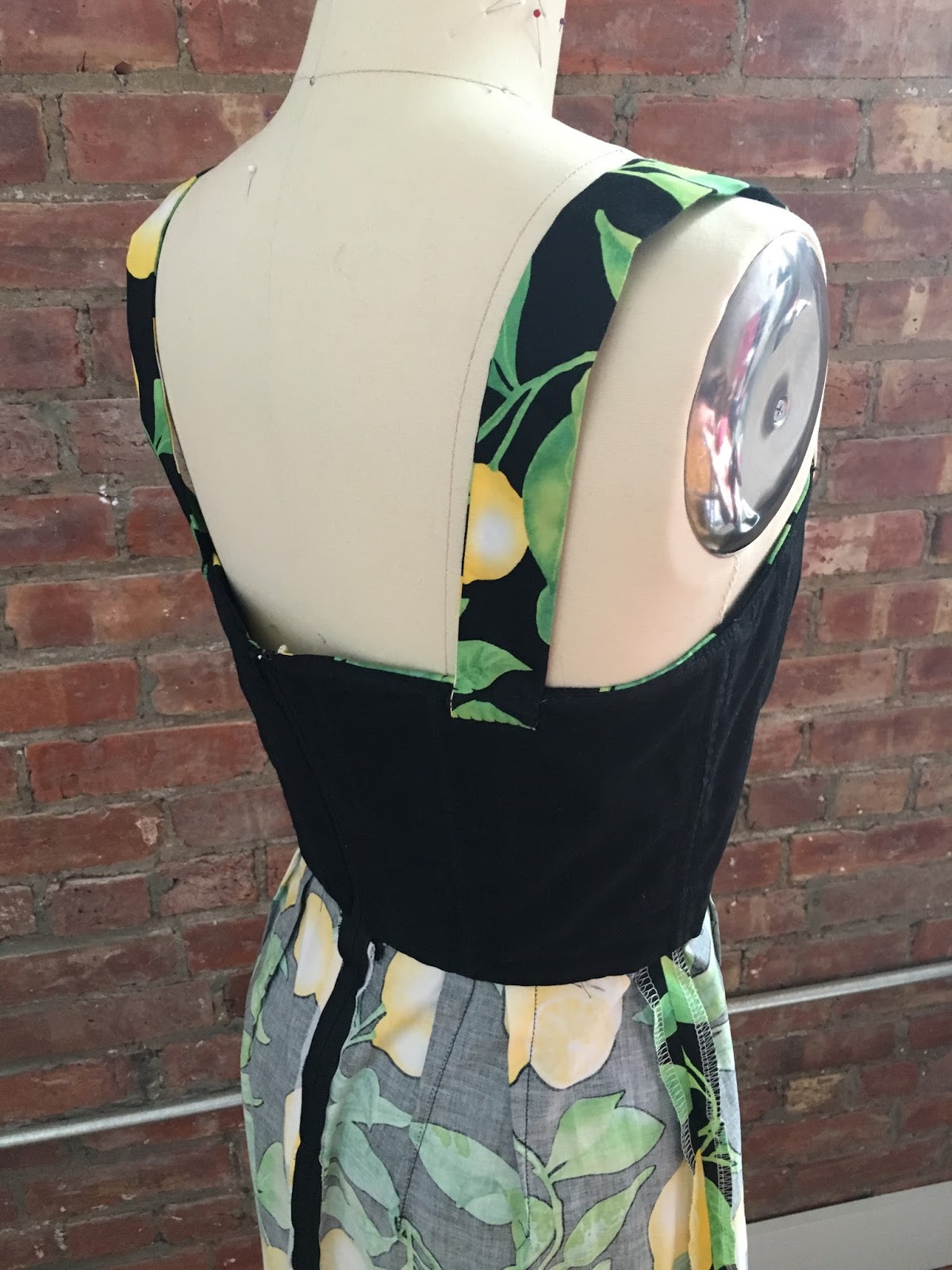 Black Sateen Lemon PrintI decided this print needed a simple, classic dress silhouette, so I decided on a summer sheath dress. The pattern is from Gertie's Ultimate Dress Book. I matched the strapless bodice with the pencil skirt, and made two simple straps to go with it.