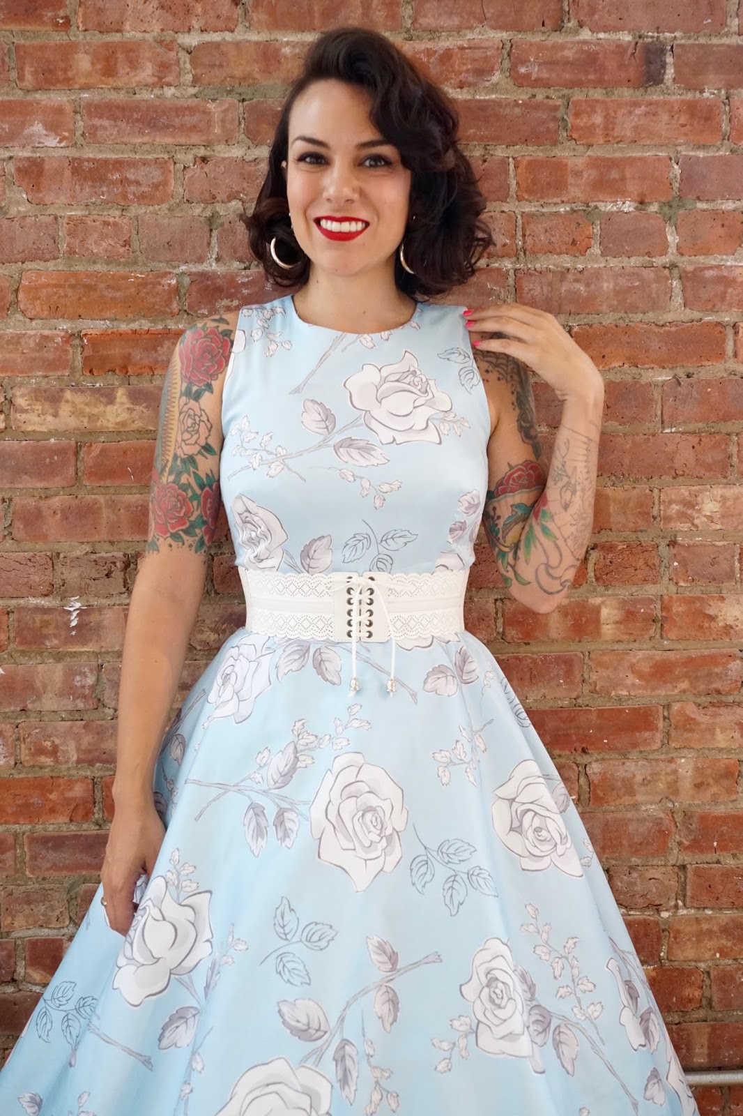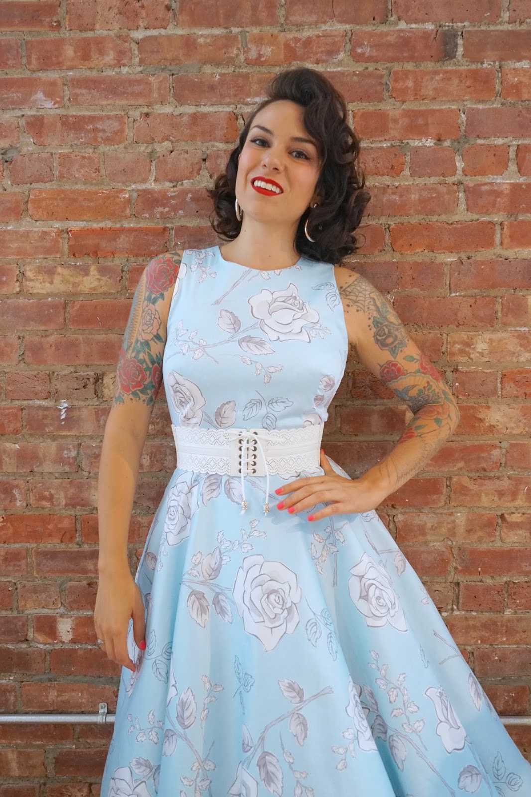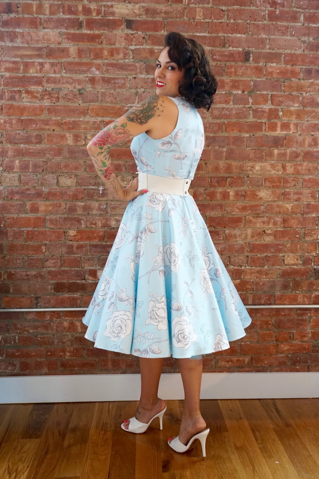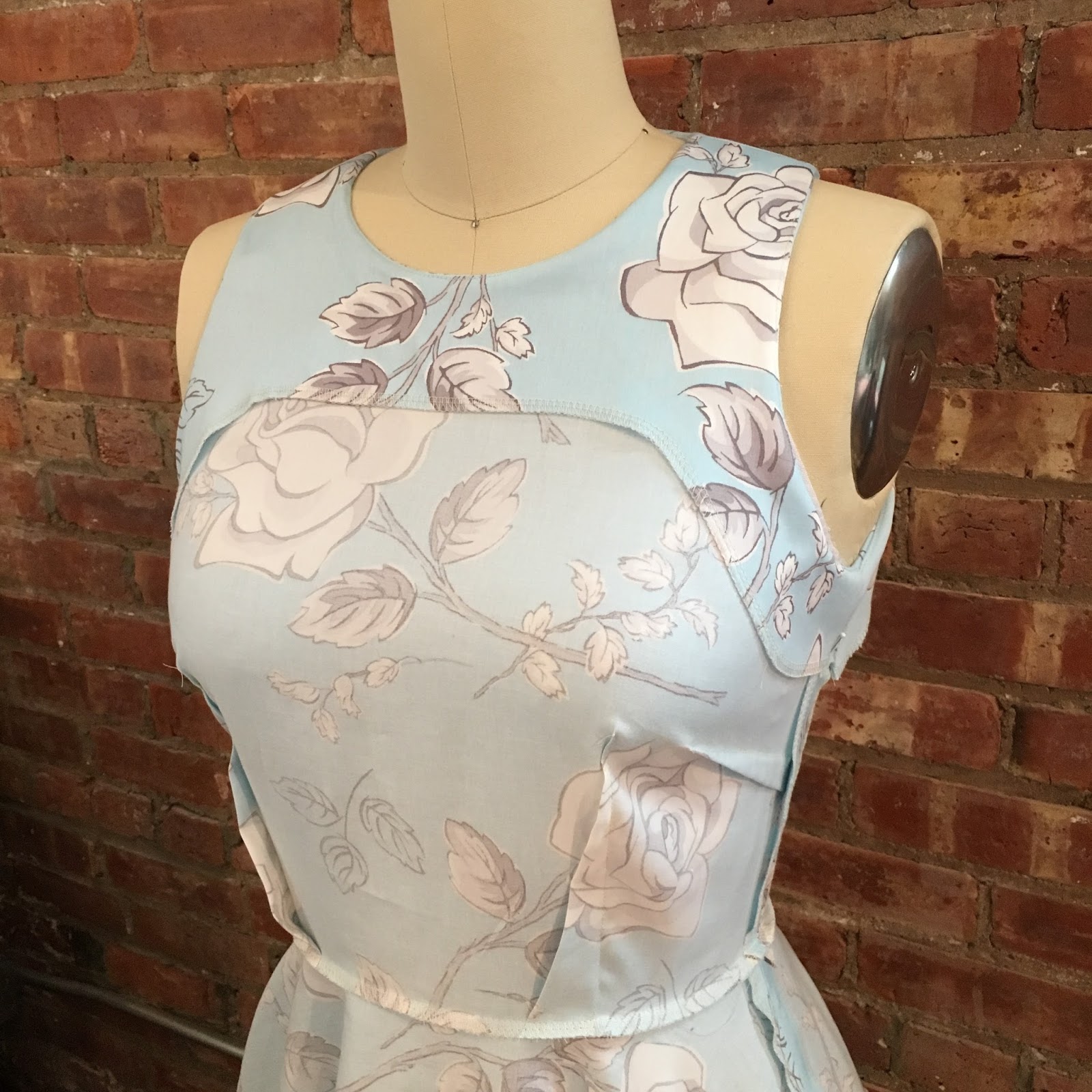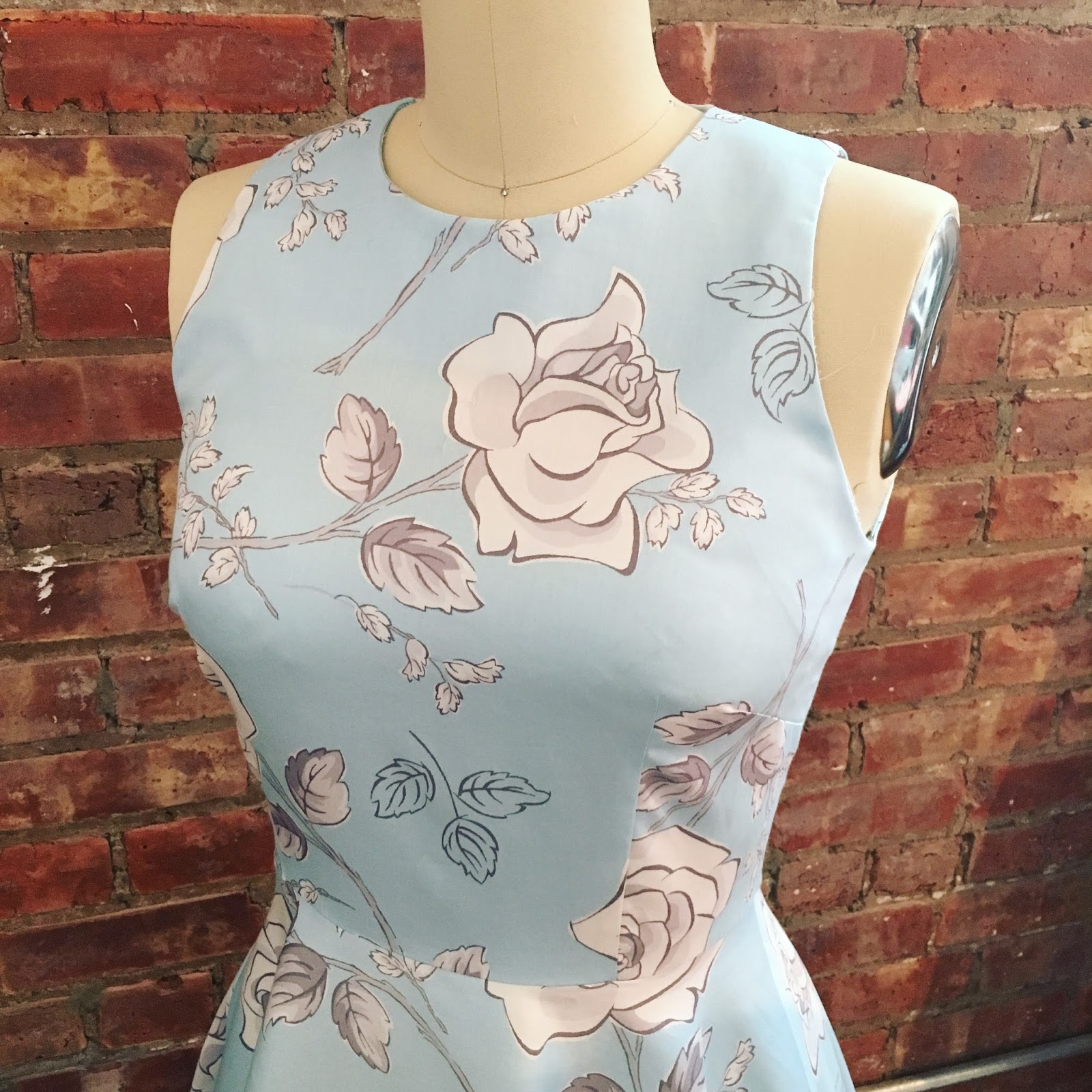 New finished dress! I'm so happy to finally showcase this sateen from my spring collection. This is the Sketch Rose in blue, a 100% cotton sateen, available at Jo-Ann Fabric and Craft Stores.