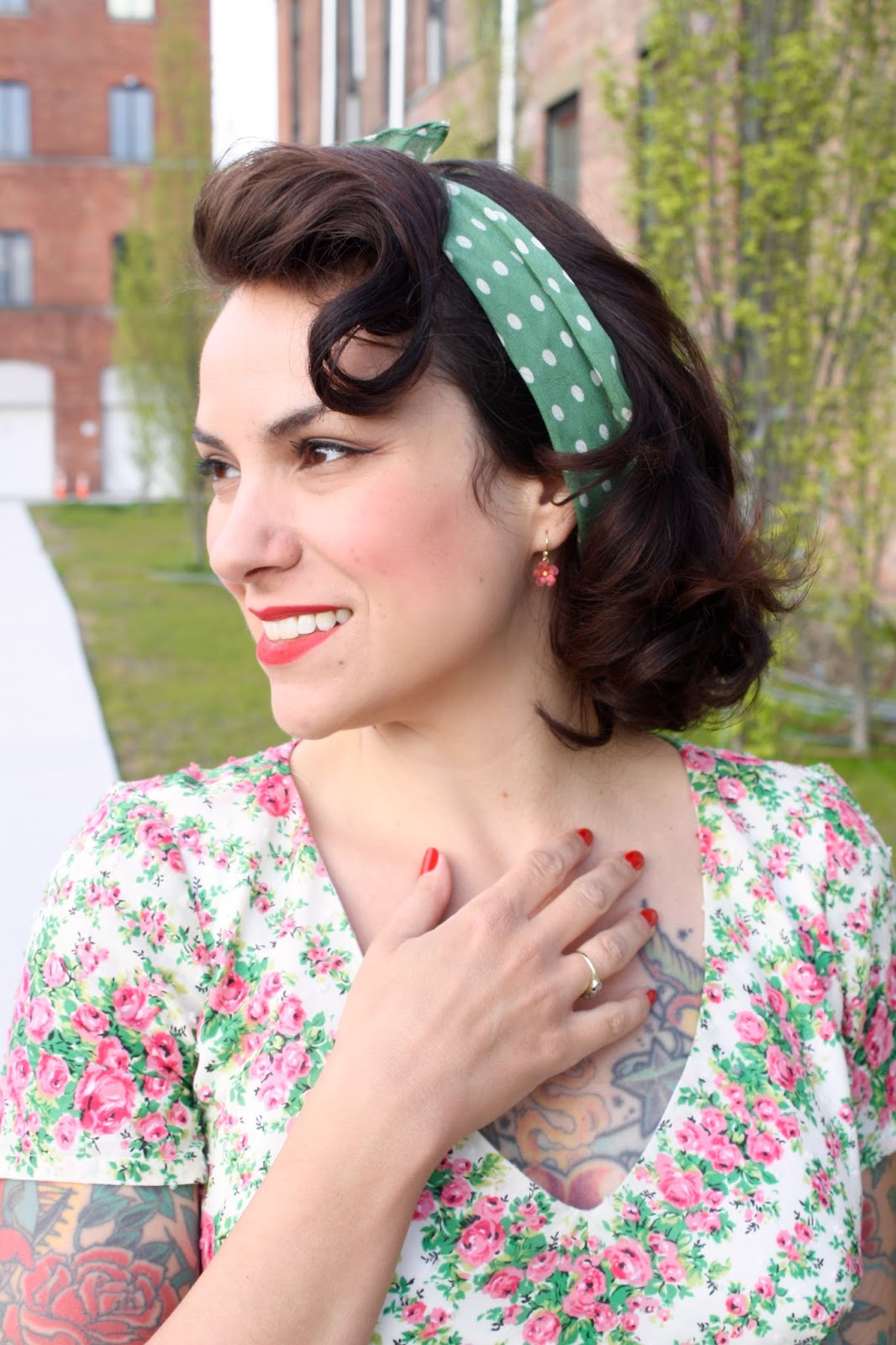 Accessories: pink Remix Rita shoes, polka dot hair scarf, and little pink earrings. And red nails, naturally.