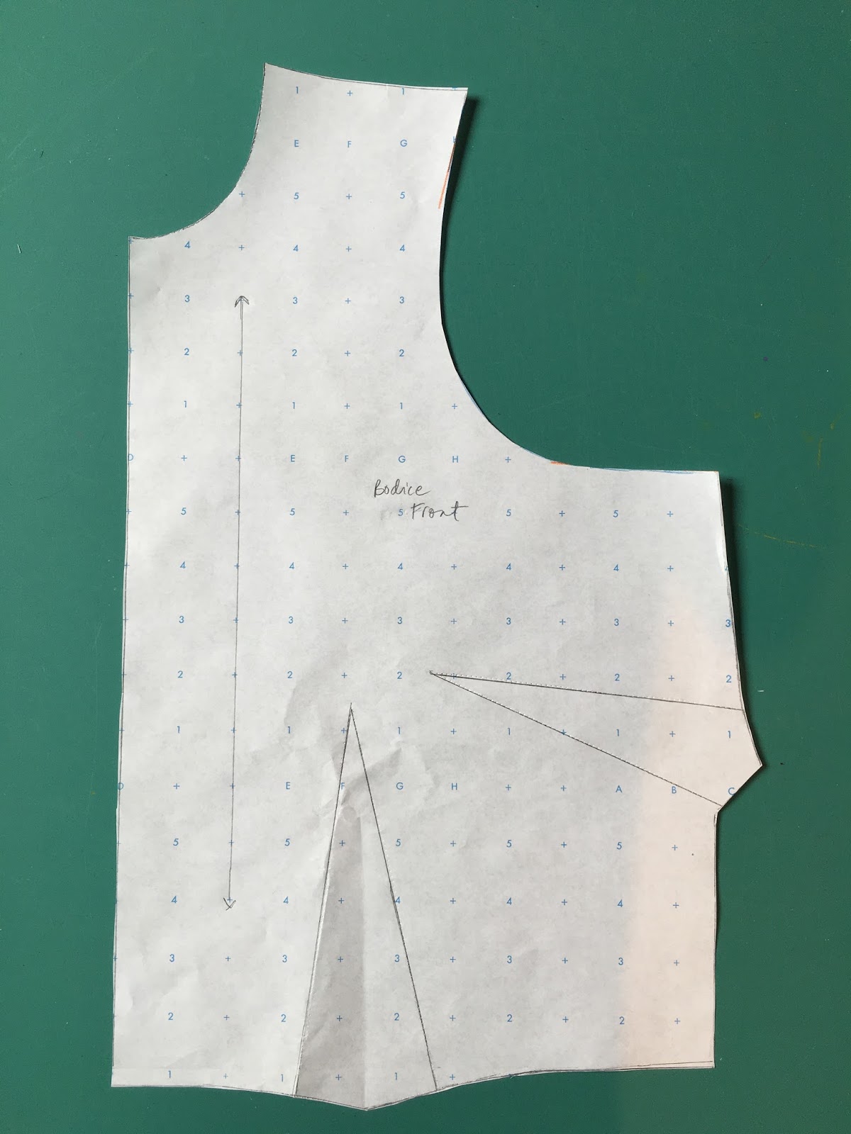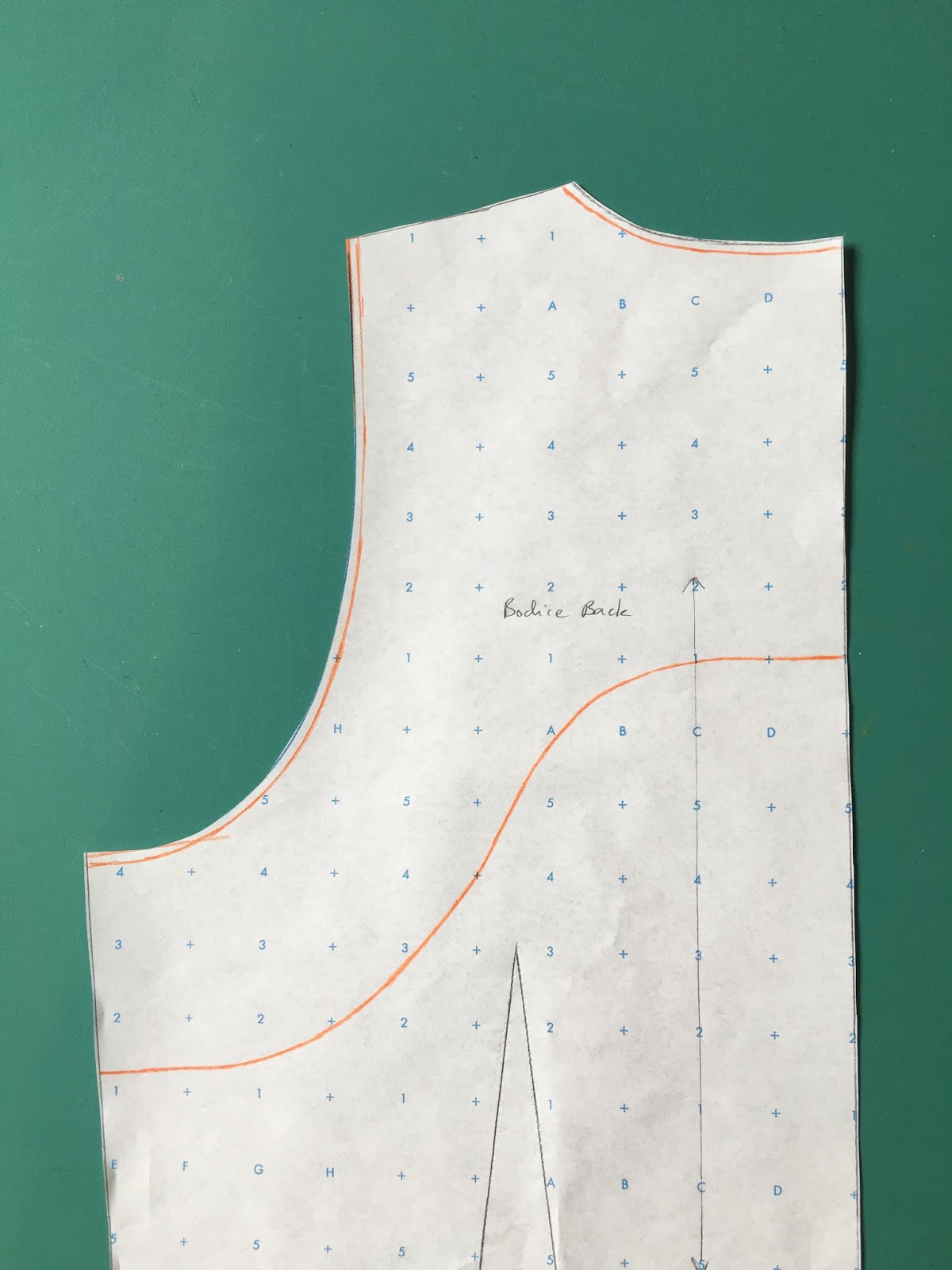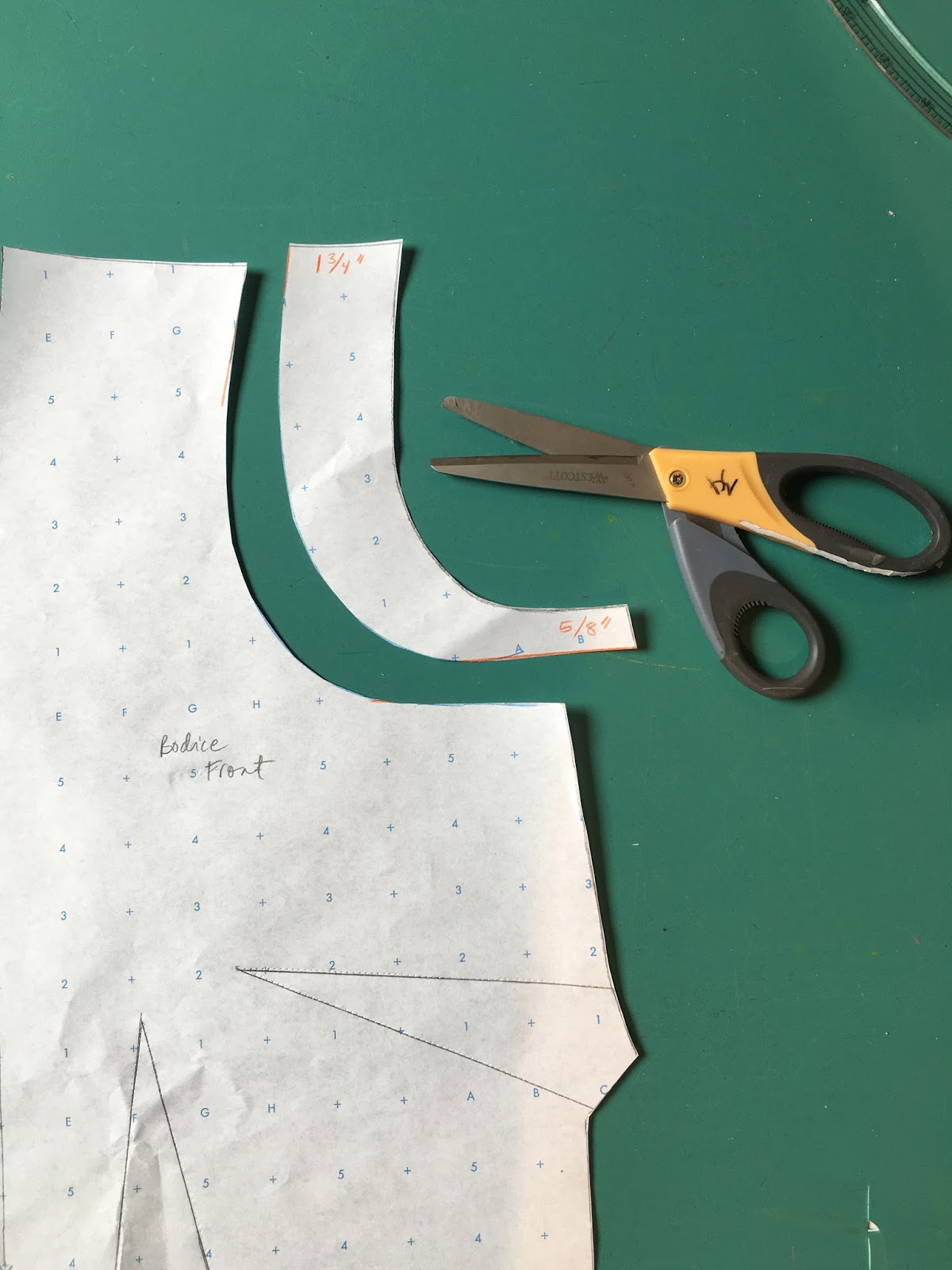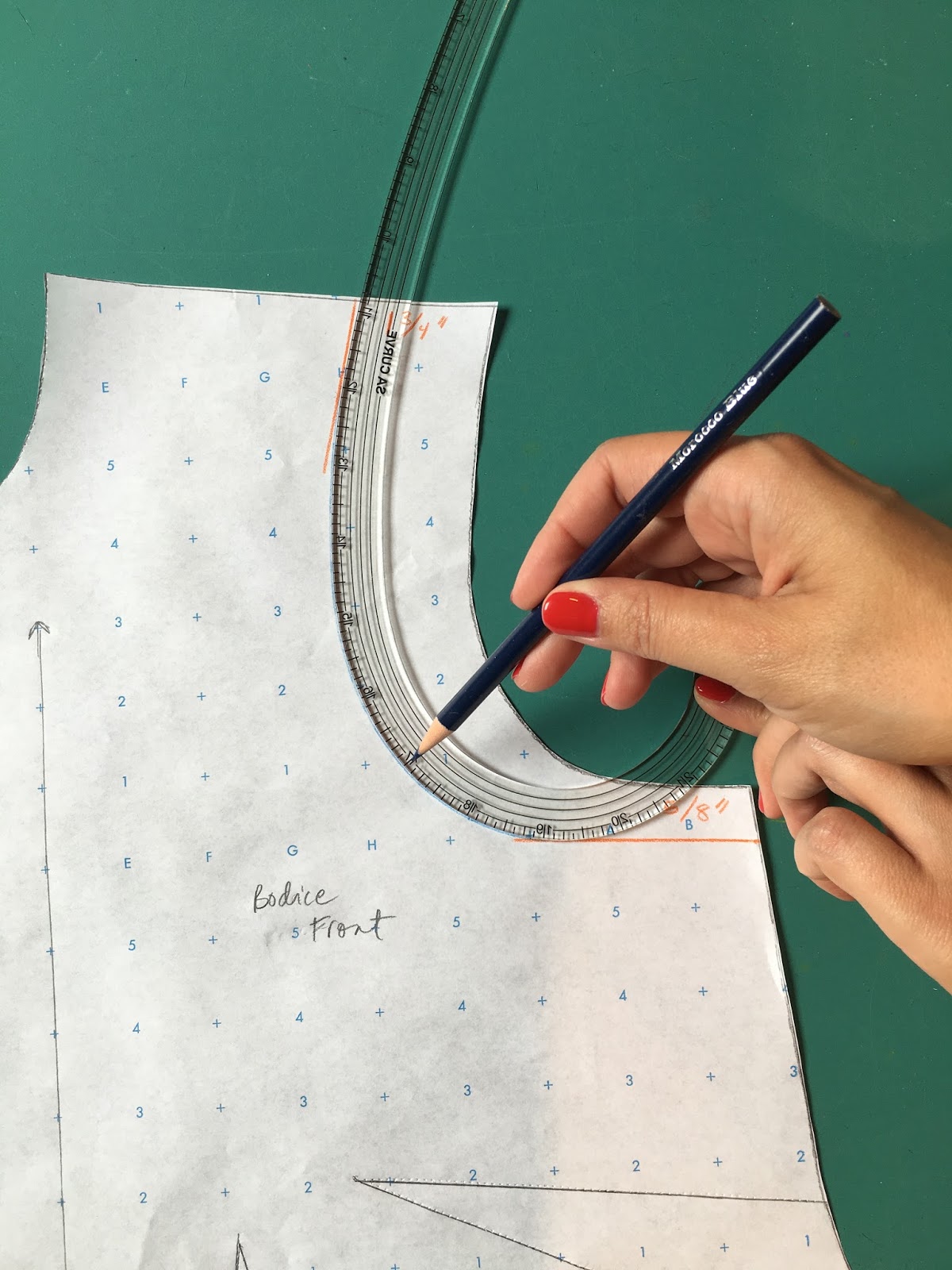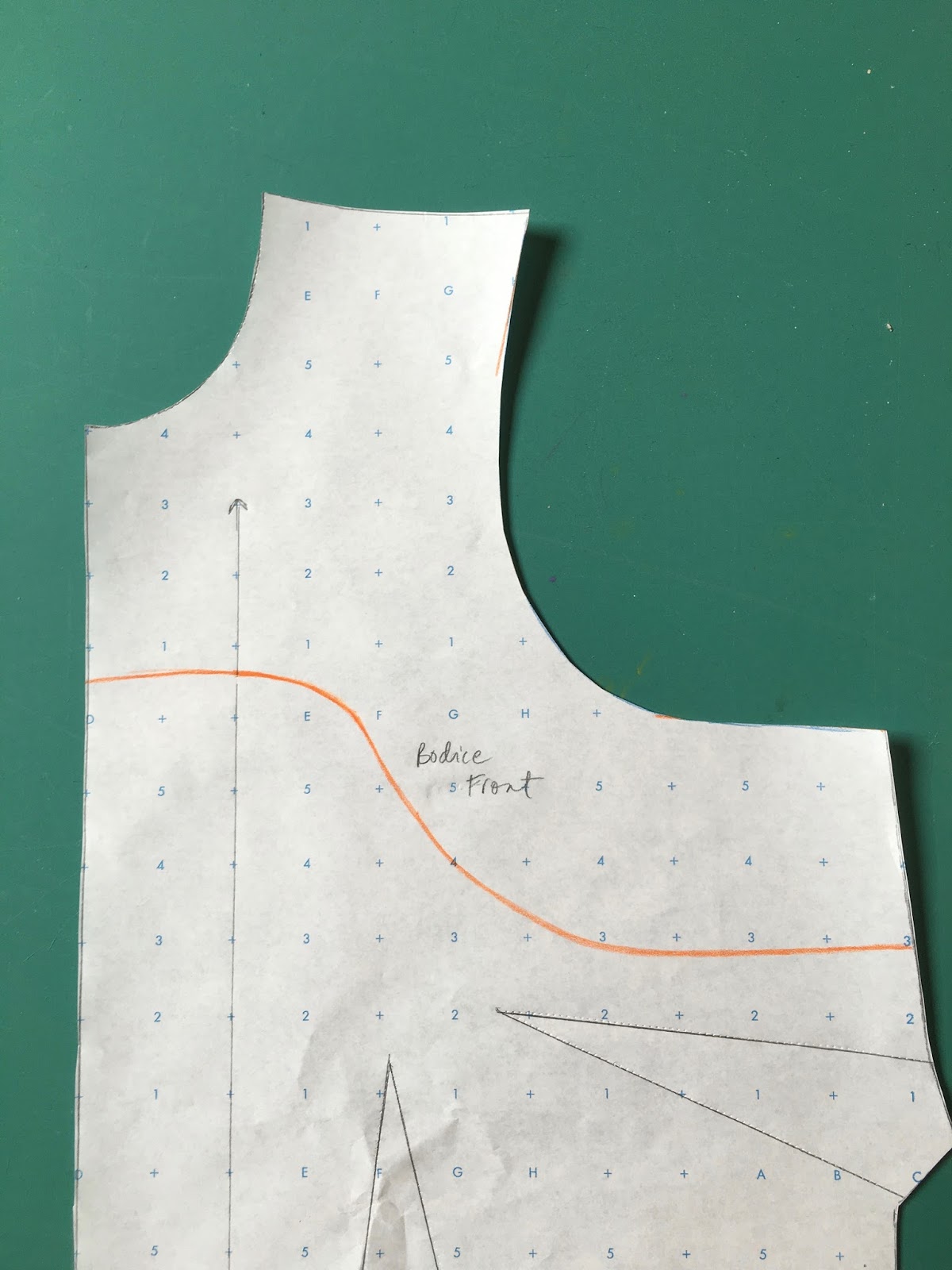 I also like to take off a scant 1/8" around the neckline and armholes, which helps the facing roll inside the garment better. See the new orange lines around the neck and armholes in the photo below!