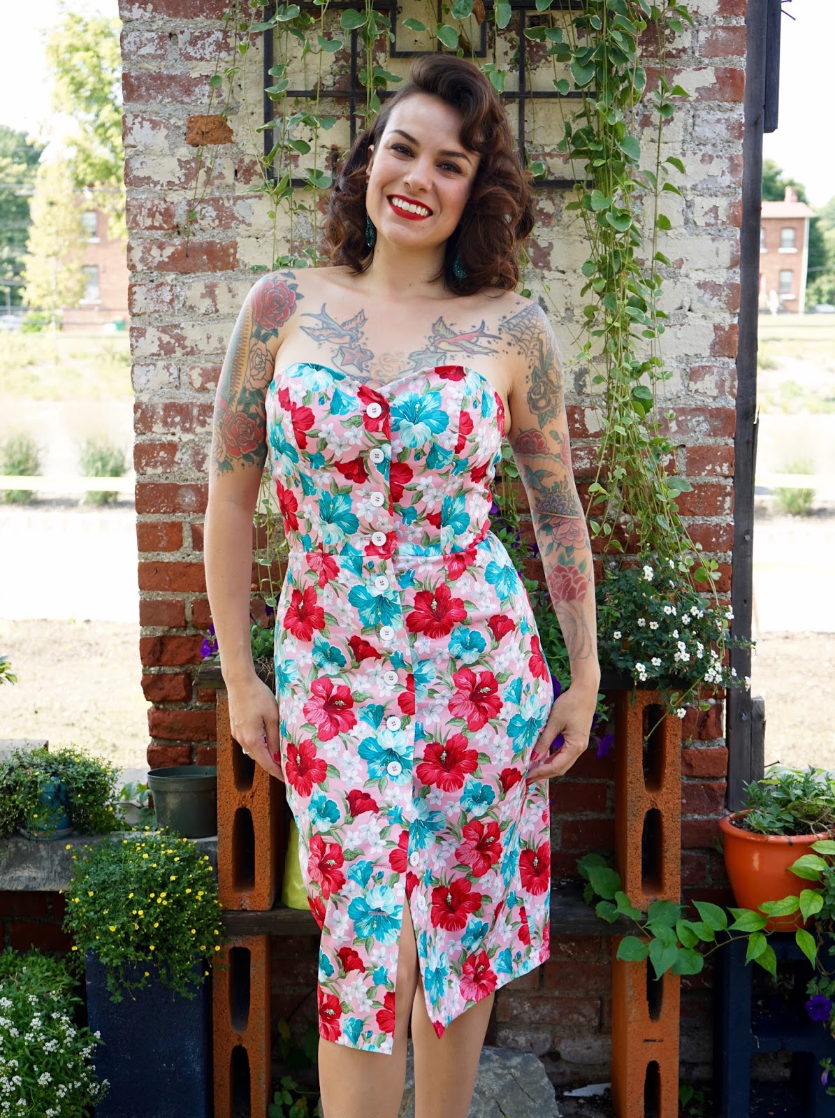 So I made this dress about a month ago and have been trying finish the tutorial for it ever since! I used the strapless bodice and pencil skirt from Gertie's Ultimate Dress Book and adapted them so that they button in the front, rather than zip in the back. While I'm finishing up the tutorial, why don't we have a fabric giveaway? I have three yards of this lovely pink tropical sateen left from my personal stash. It was from my spring fabric line, and is now sold out from Jo-Ann stores.