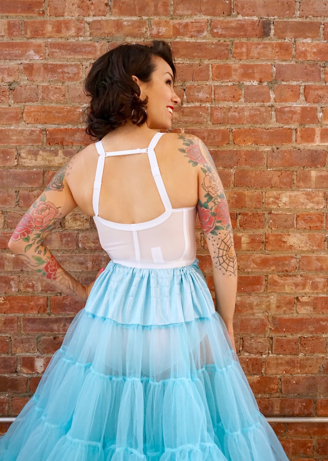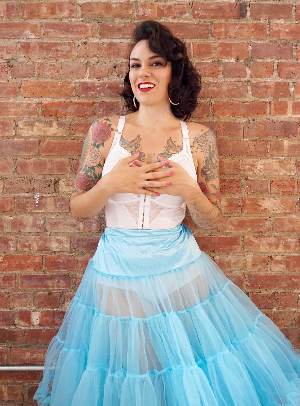 The longline bra requires high waisted panties for a smooth line, and then a crinoline (this one is by Hell Bunny) gives the skirt lots of fluff.