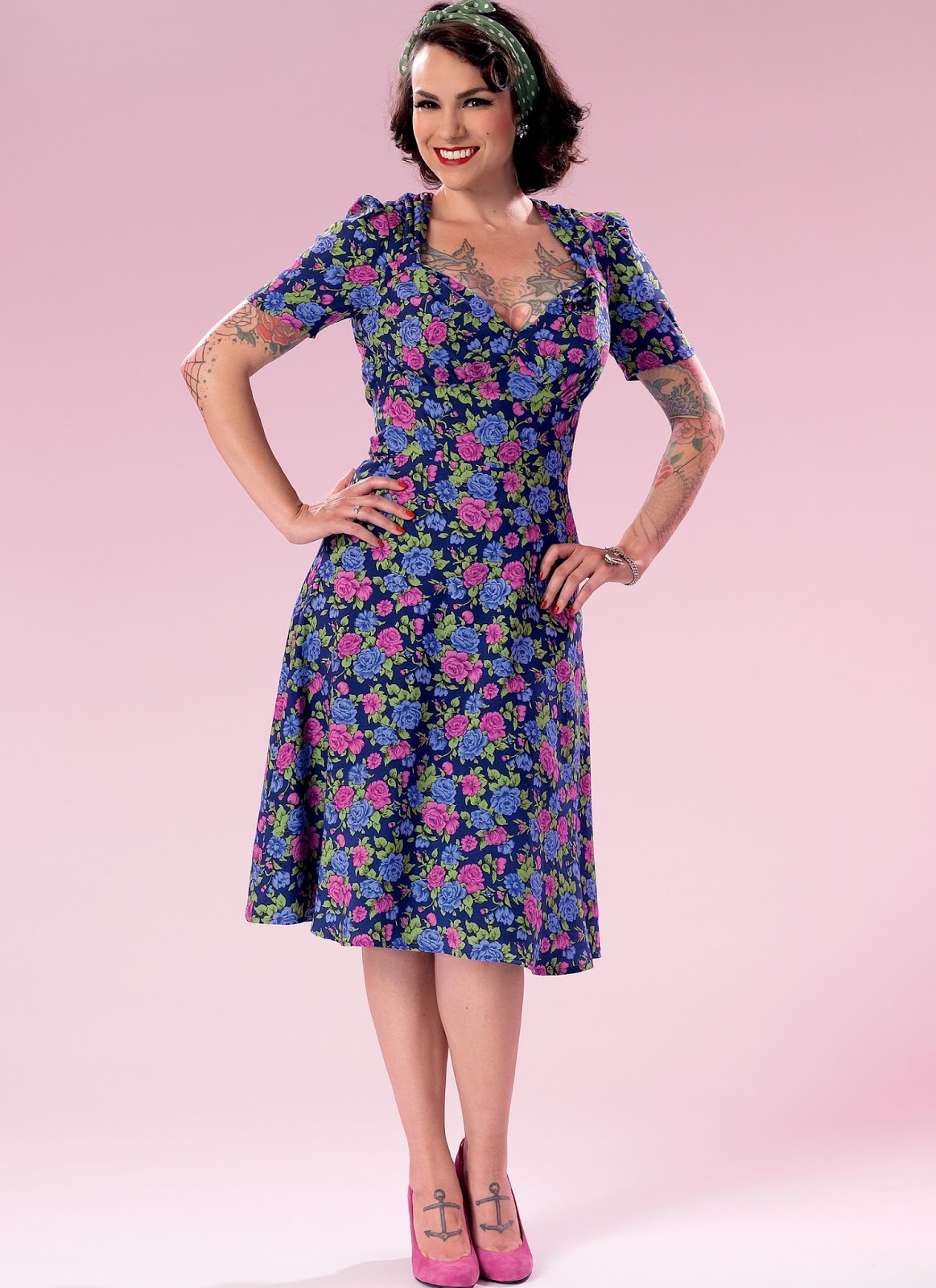 I have two new patterns out in my "Patterns by Gertie" line with Butterick. In a little change of pace for me, they're both very '40s-inspired rather than my usual '50s designs. The first is B6380, a sweetheart neckline dress with a gathered bust and swing skirt.