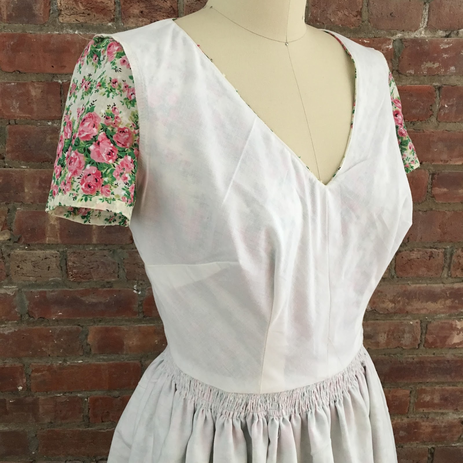 I became dirndl-obsessed after my recent trips to Germany and Austria, and loved the idea of making a dirndl-ish dress that could be worn everyday. This design is my answer to that idea.The dress has puff sleeves that resemble a dirndl blouse, a low-cut square neckline, princess seams, a front zipper, a gathered circle skirt with a hemline ruffle, and a waist sash that calls to mind the traditional dirndl apron.