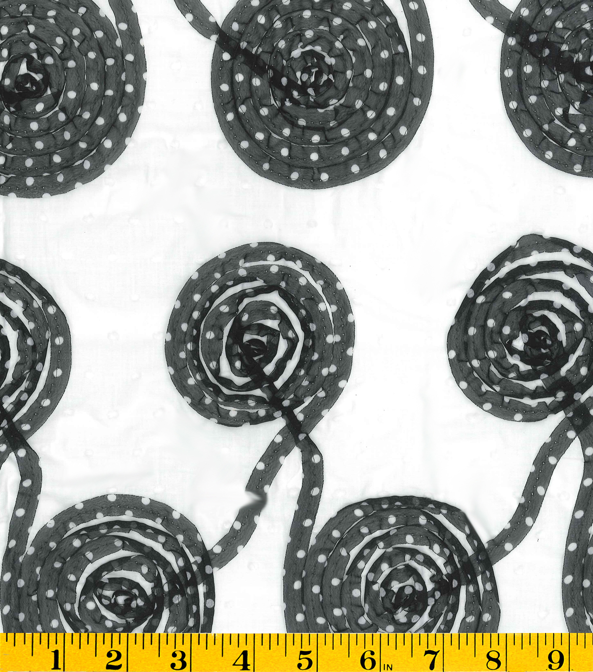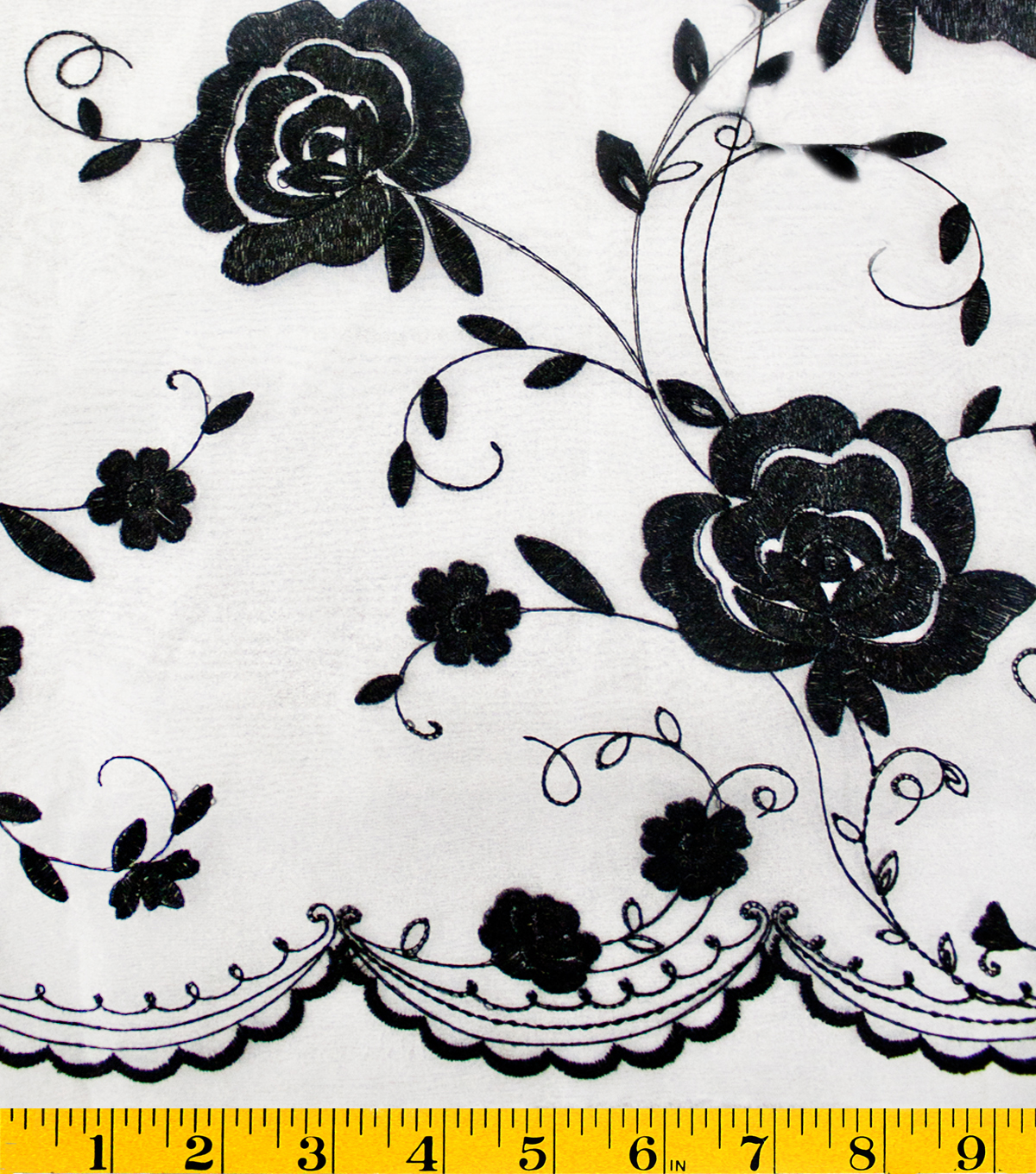 The first is this white organza embroidered with black flowers with a scalloped border.
