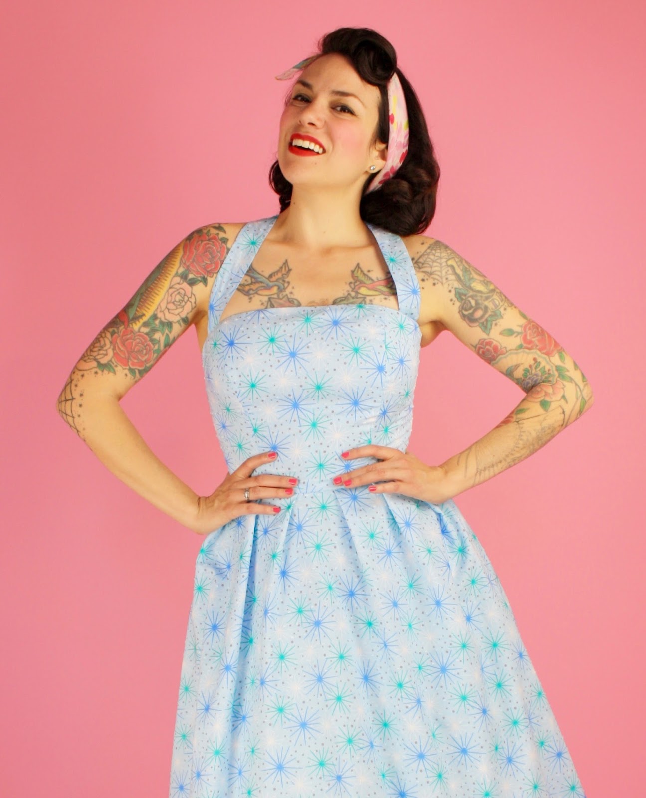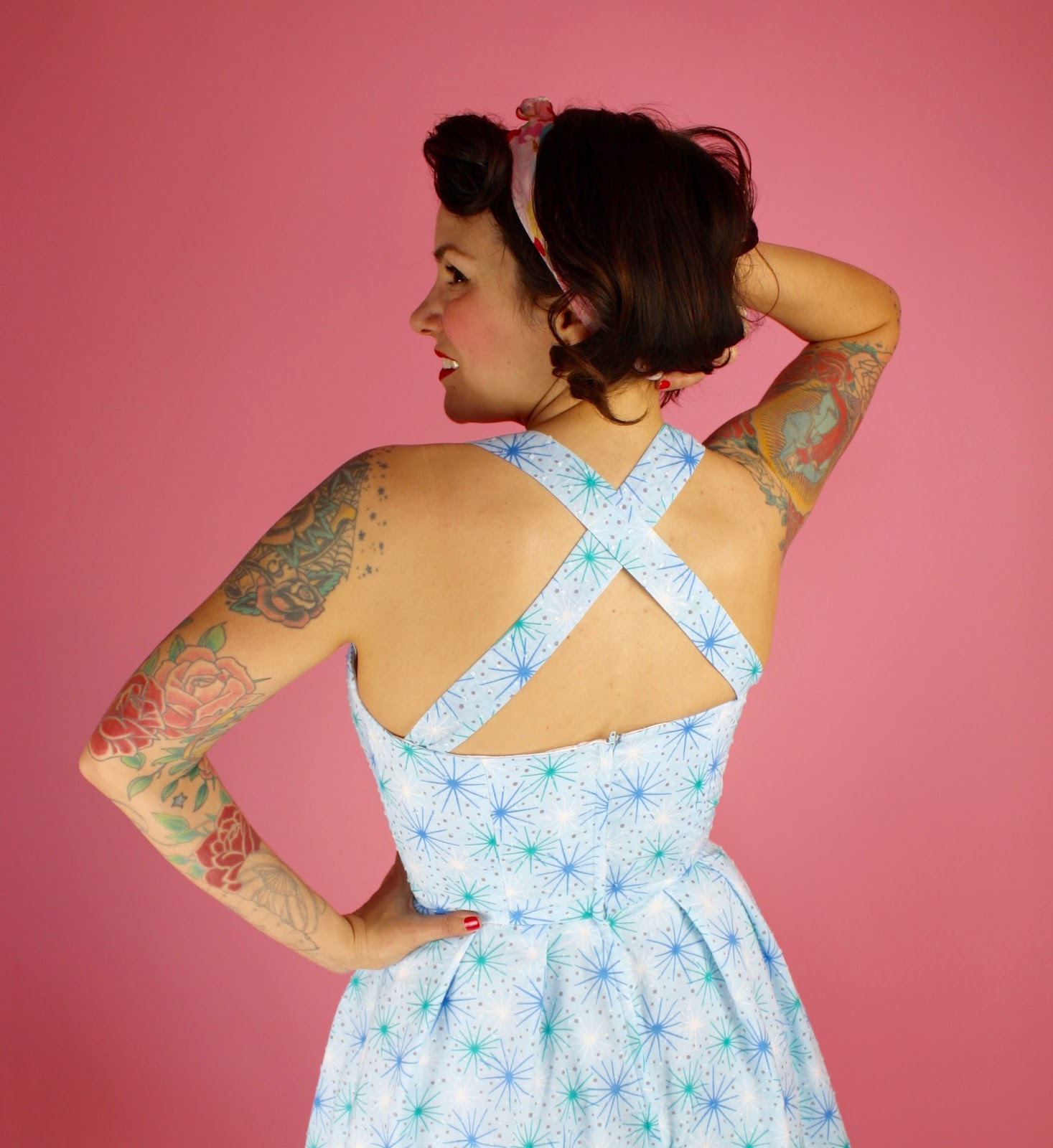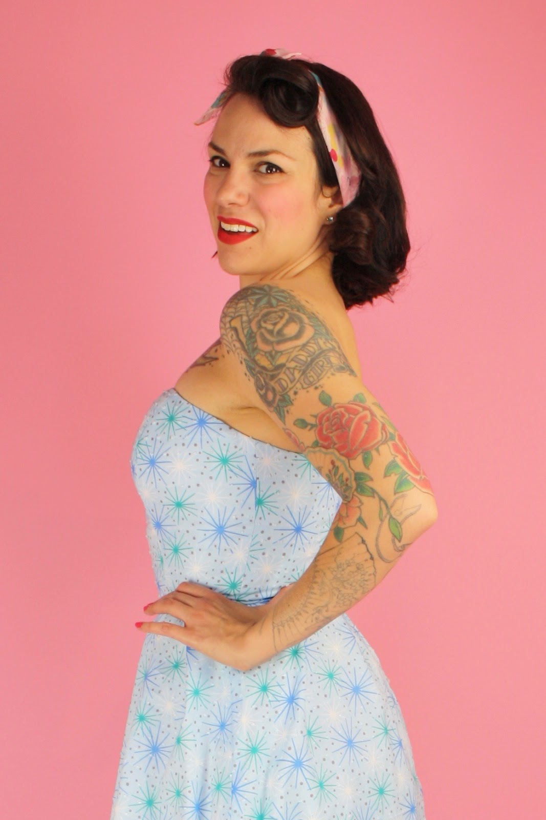 I made it in one of my new fabrics. This is an atomic starburst print on a cotton Swiss dot. Available at Jo-Ann Fabric and Craft Stores! I love the Jetsons feel of the print.