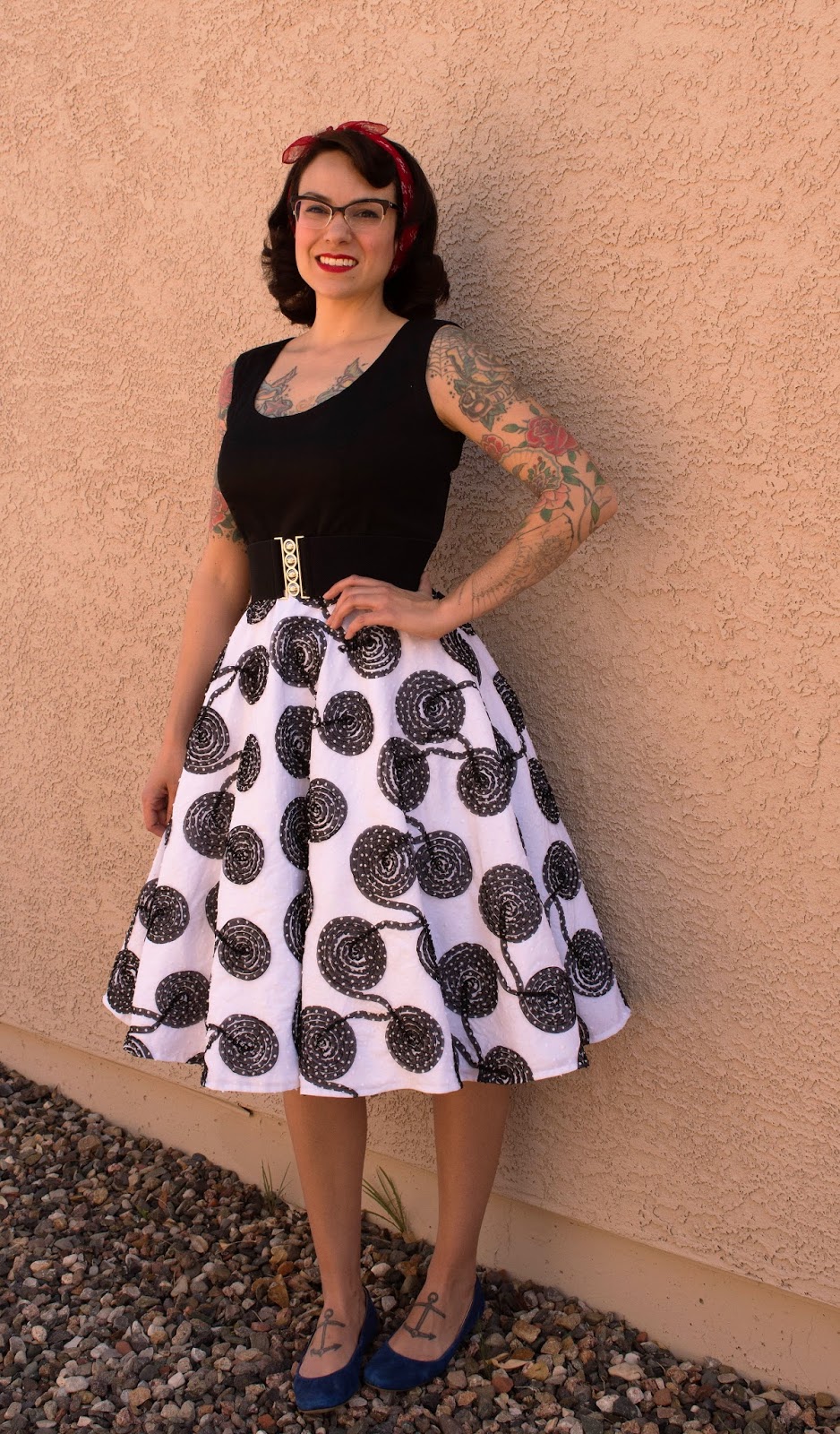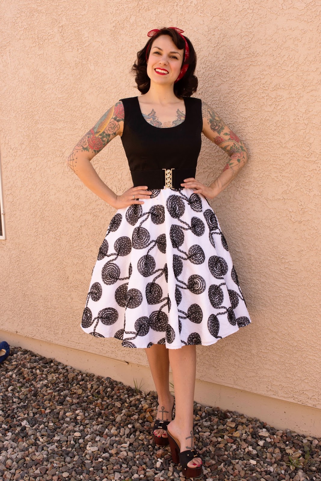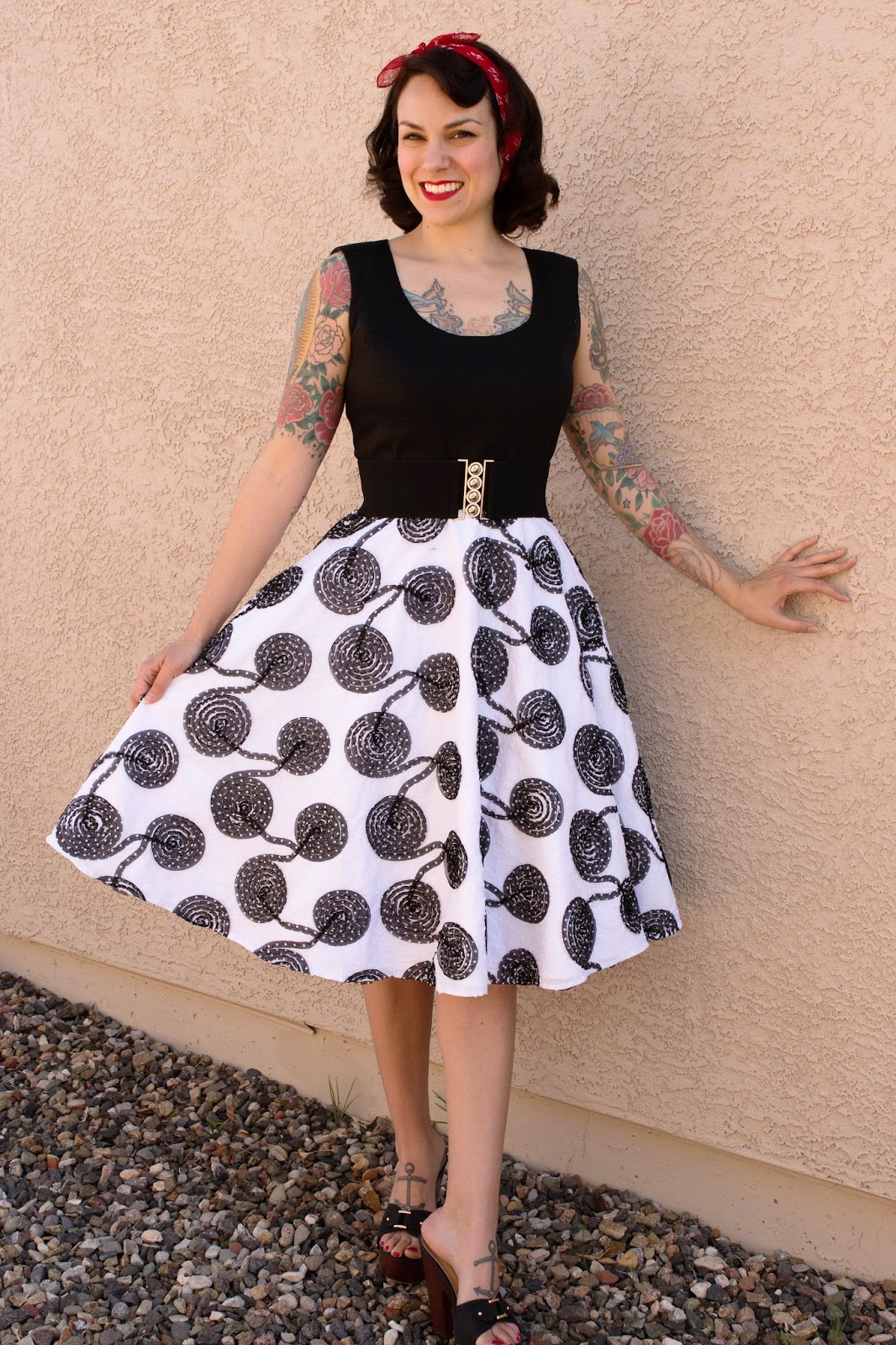 Another dress completed! This is part of my Arizona mother/daughter project to make a bunch of dresses from patterns in my new book, all using fabrics from my new spring line. Synergy! I've always liked the idea of using two different fabrics in a dress to get a separates look, but I don't think I've ever done it. For this design, I used the Princess Seam bodice from Gertie's Ultimate Dress Book in black stretch sateen (and it's lined in the same fabric for a clean look). Then the skirt is the three-quarter circle skirt in this really cool embroidered Swiss Dot cotton.