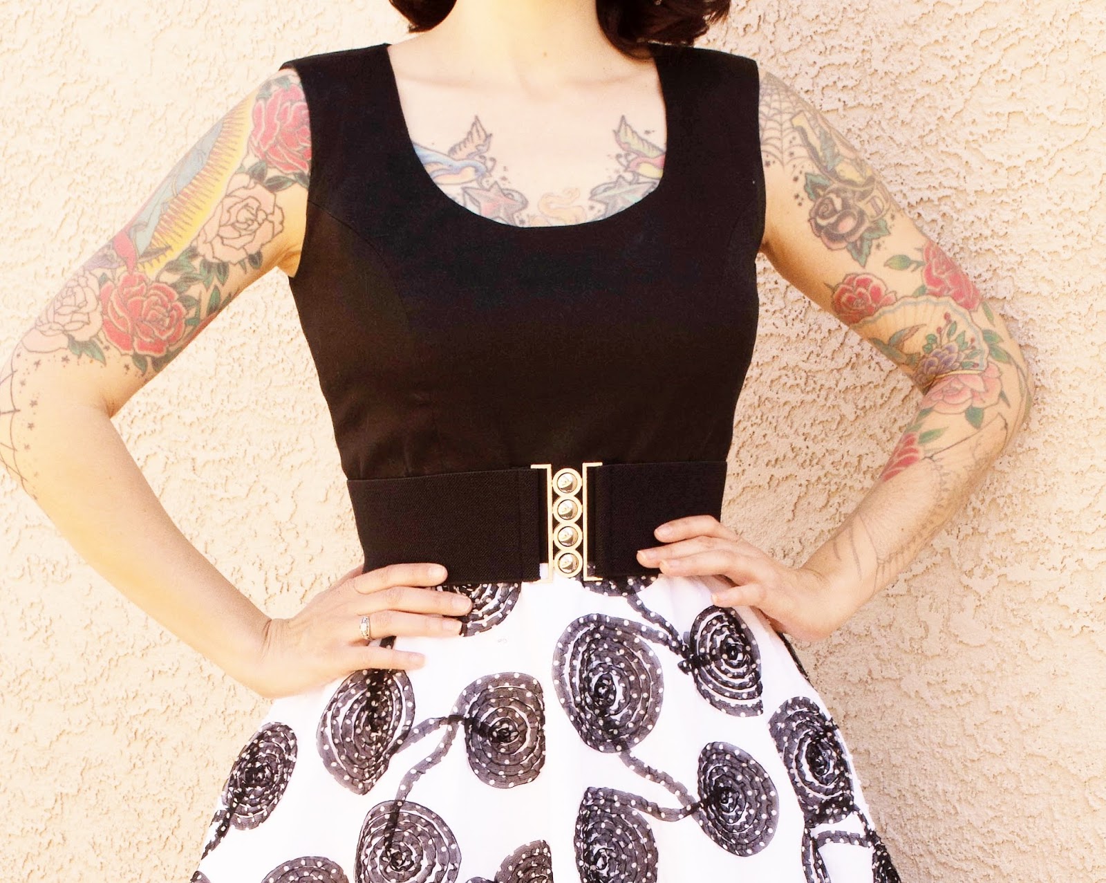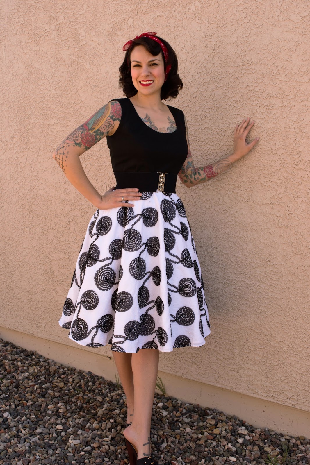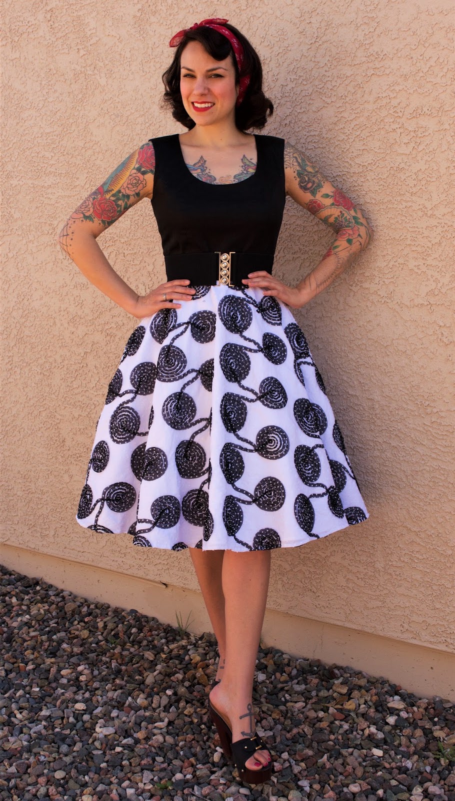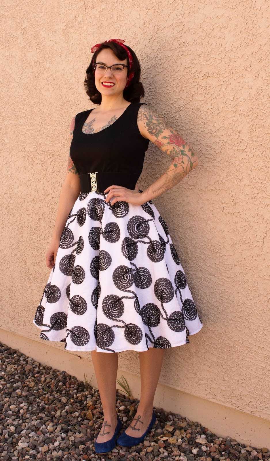 Another dress completed! This is part of my Arizona mother/daughter project to make a bunch of dresses from patterns in my new book, all using fabrics from my new spring line. Synergy! I've always liked the idea of using two different fabrics in a dress to get a separates look, but I don't think I've ever done it. For this design, I used the Princess Seam bodice from Gertie's Ultimate Dress Book in black stretch sateen (and it's lined in the same fabric for a clean look). Then the skirt is the three-quarter circle skirt in this really cool embroidered Swiss Dot cotton.