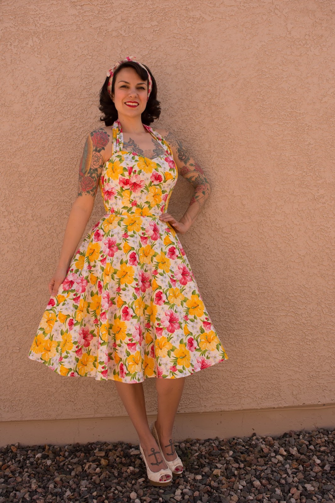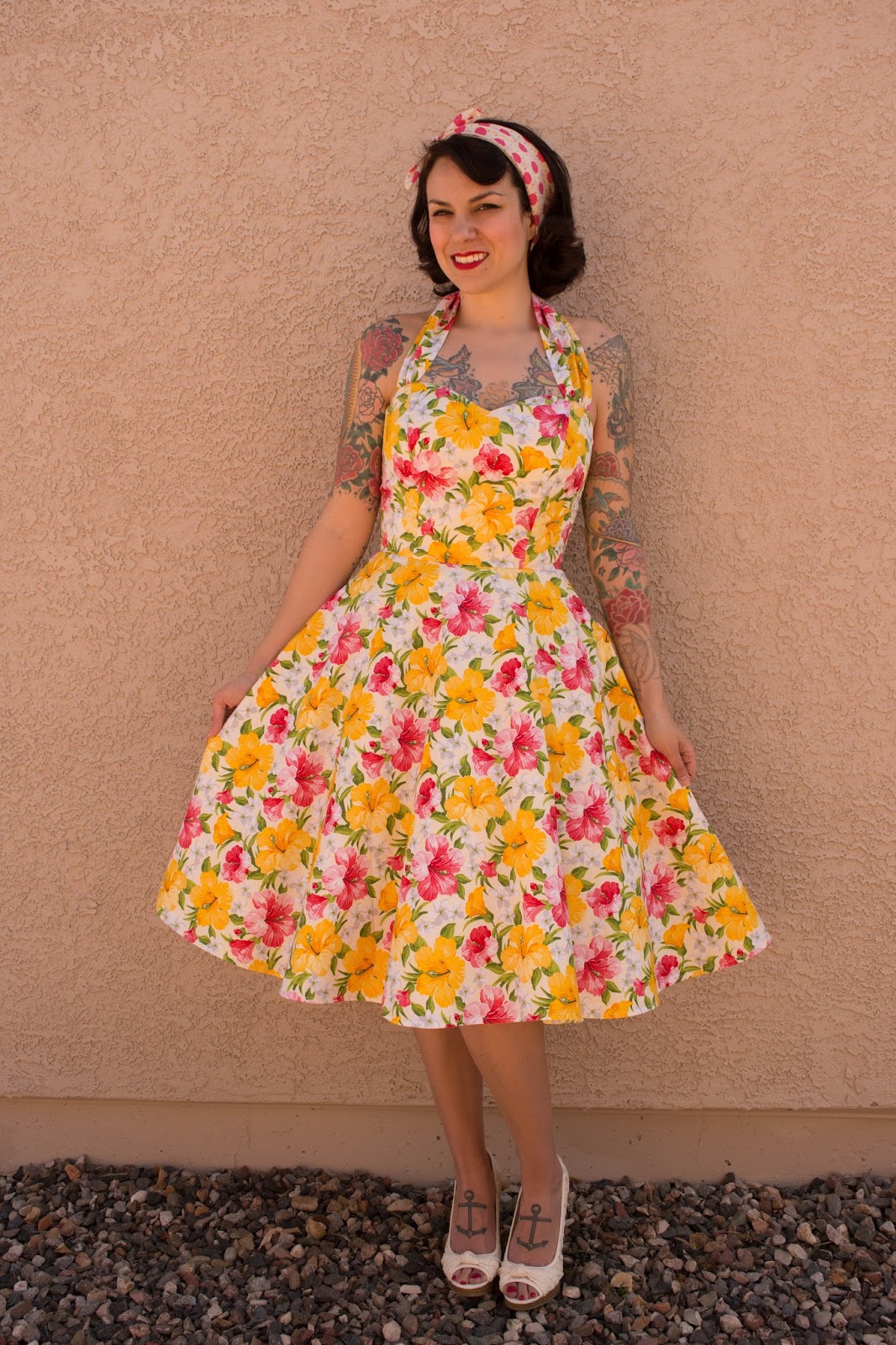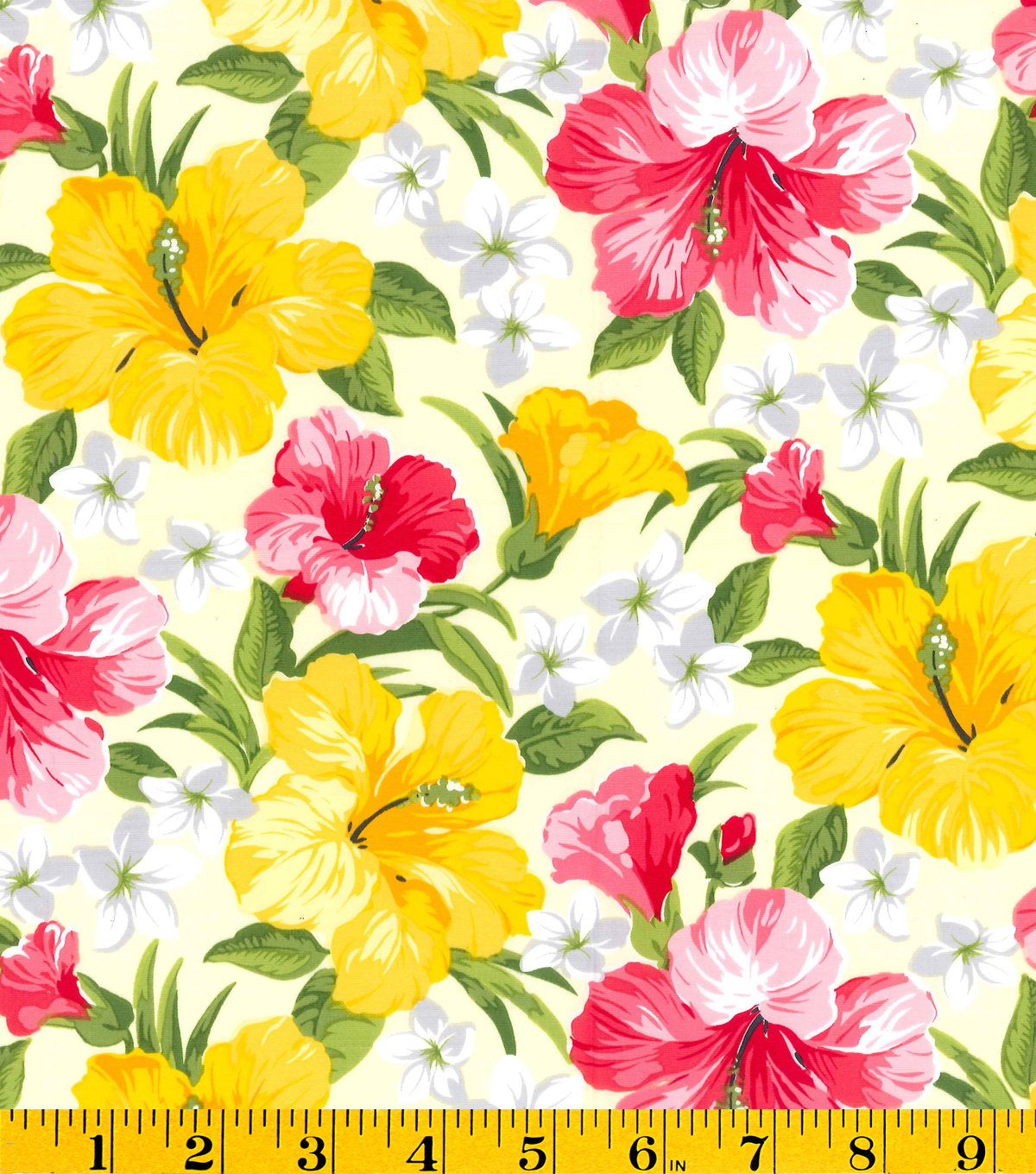 For the first dress, I chose this cheerful yellow and pink Hawaiian print poplin.
