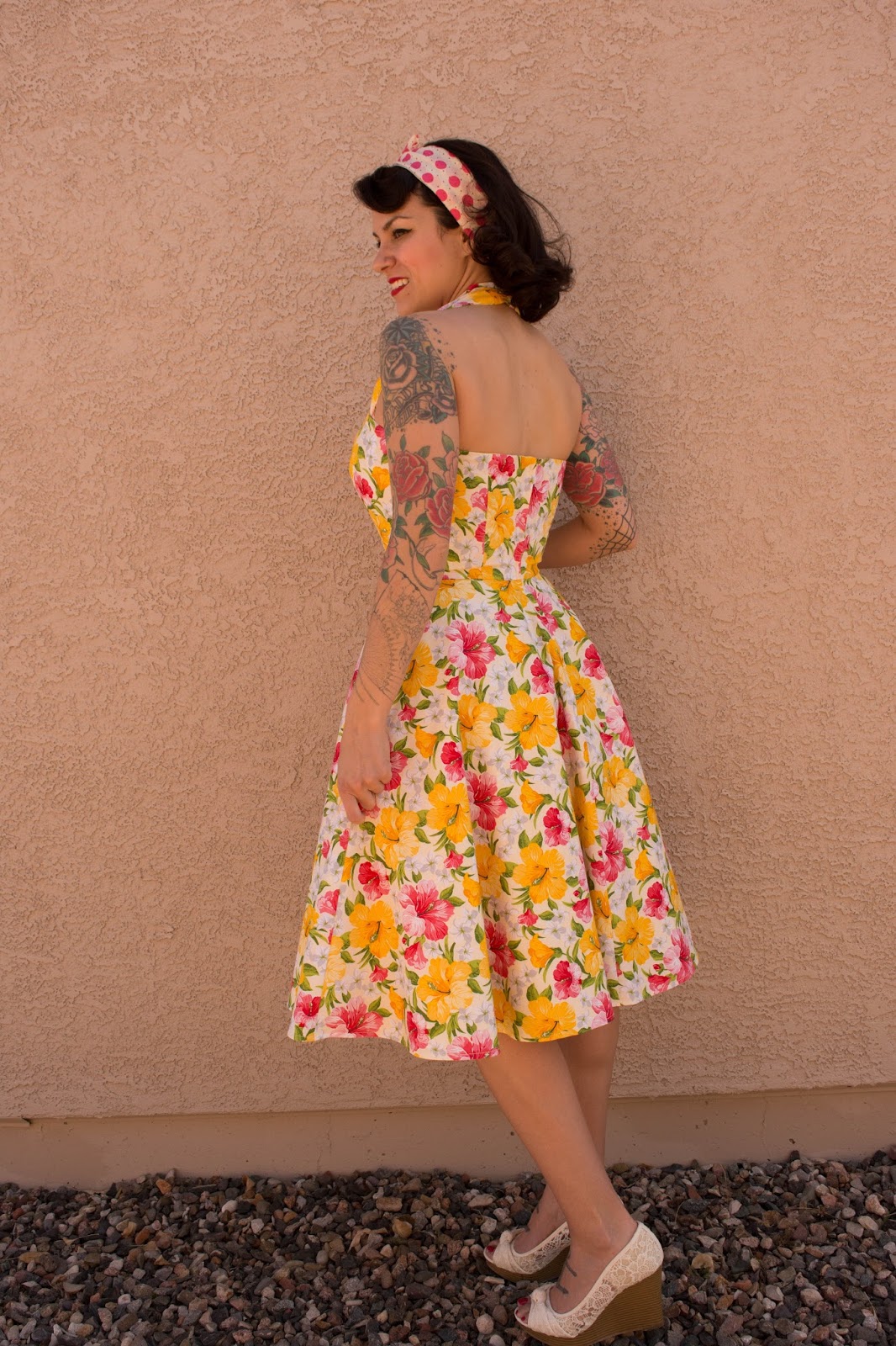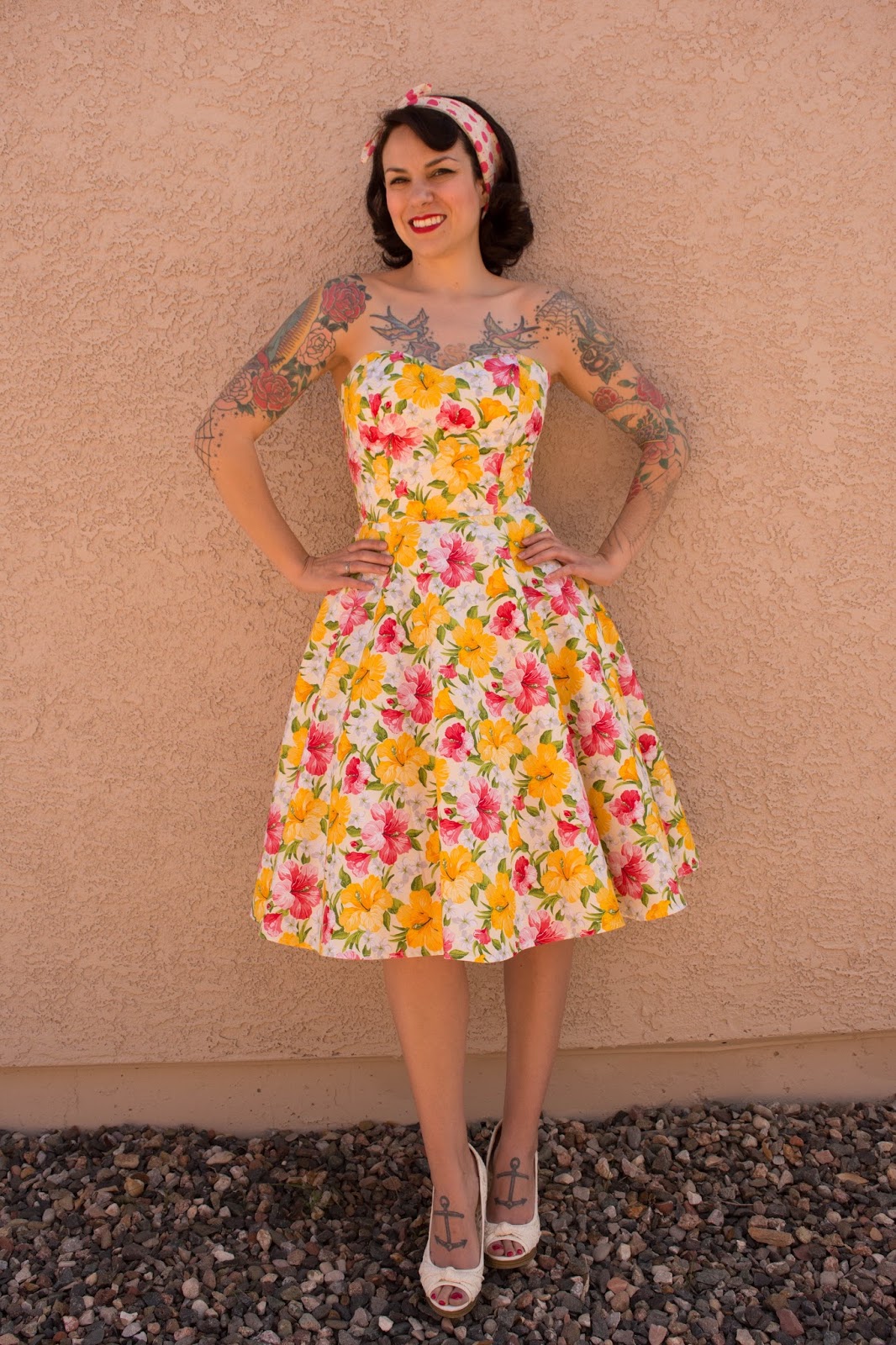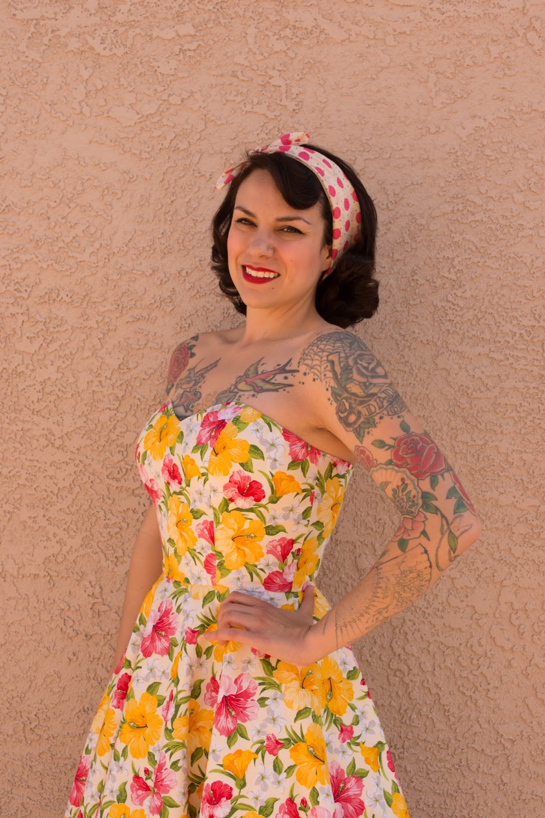 For the first dress, I chose this cheerful yellow and pink Hawaiian print poplin.